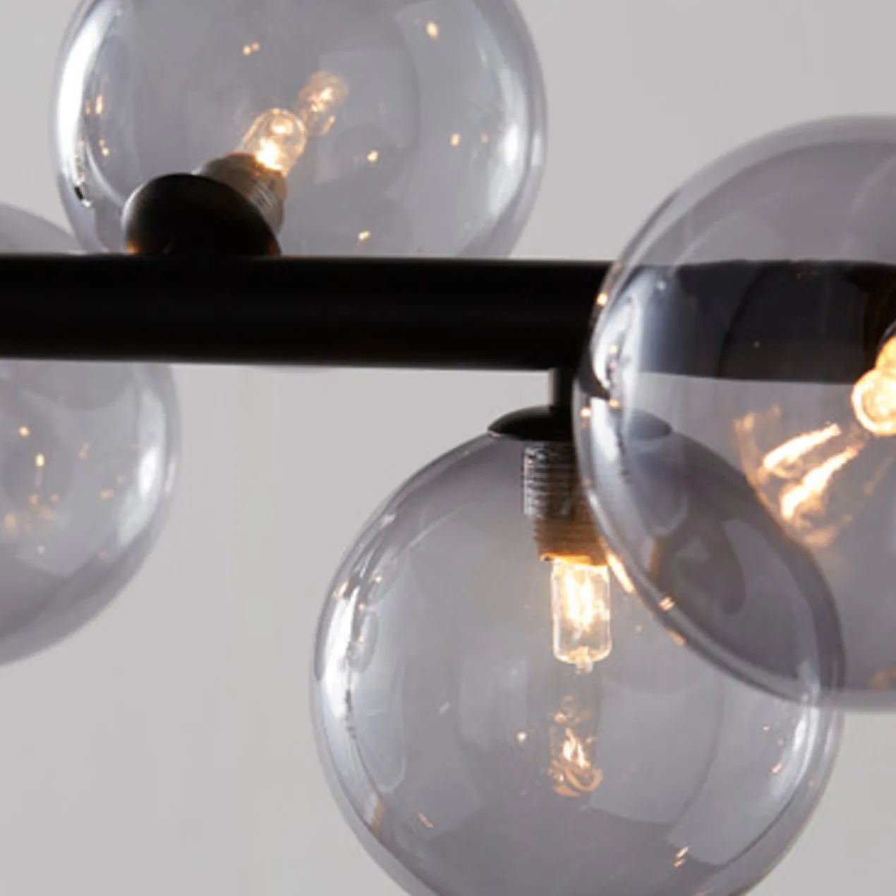 Radiating light in three directions, this chandelier’s linear blackened iron frame and smoky glass globe shades make an eye-catching statement over a dining table or kitchen island.