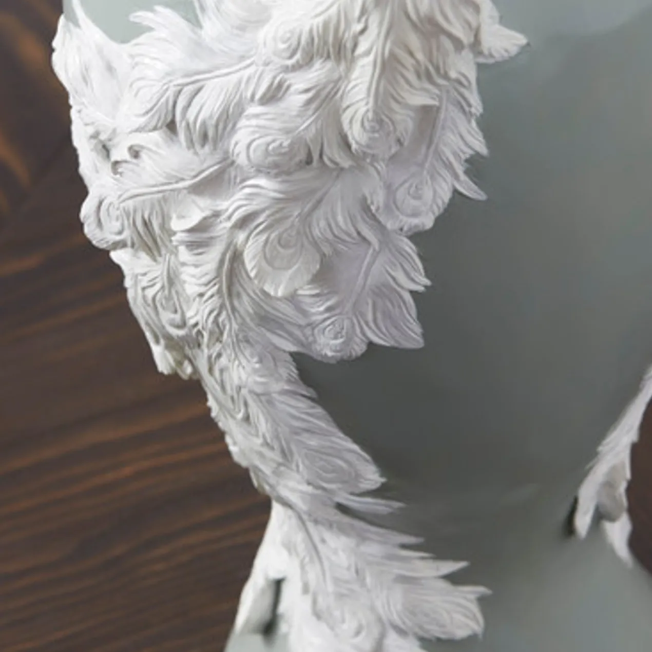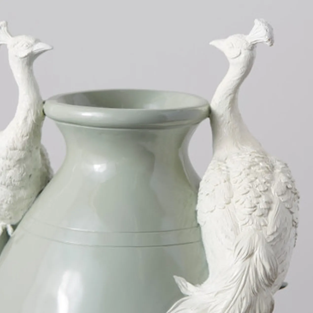 A stunning accent even when it’s not holding blooms or branches, this floor vase is made from lightweight polyresin in a soft green hue with an intricate, dimensional peacock motif that wraps around the exterior.