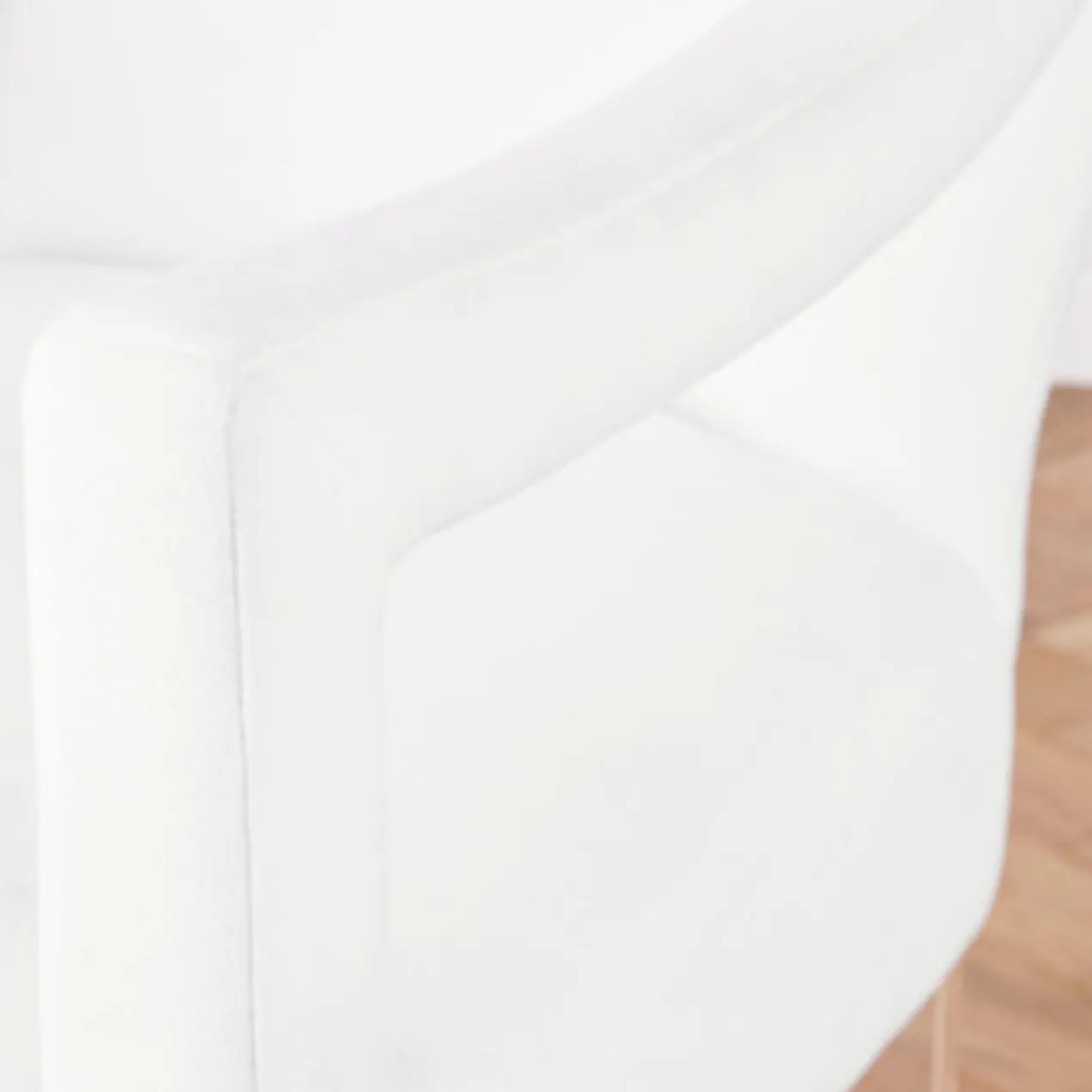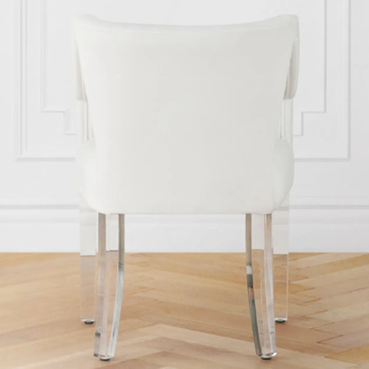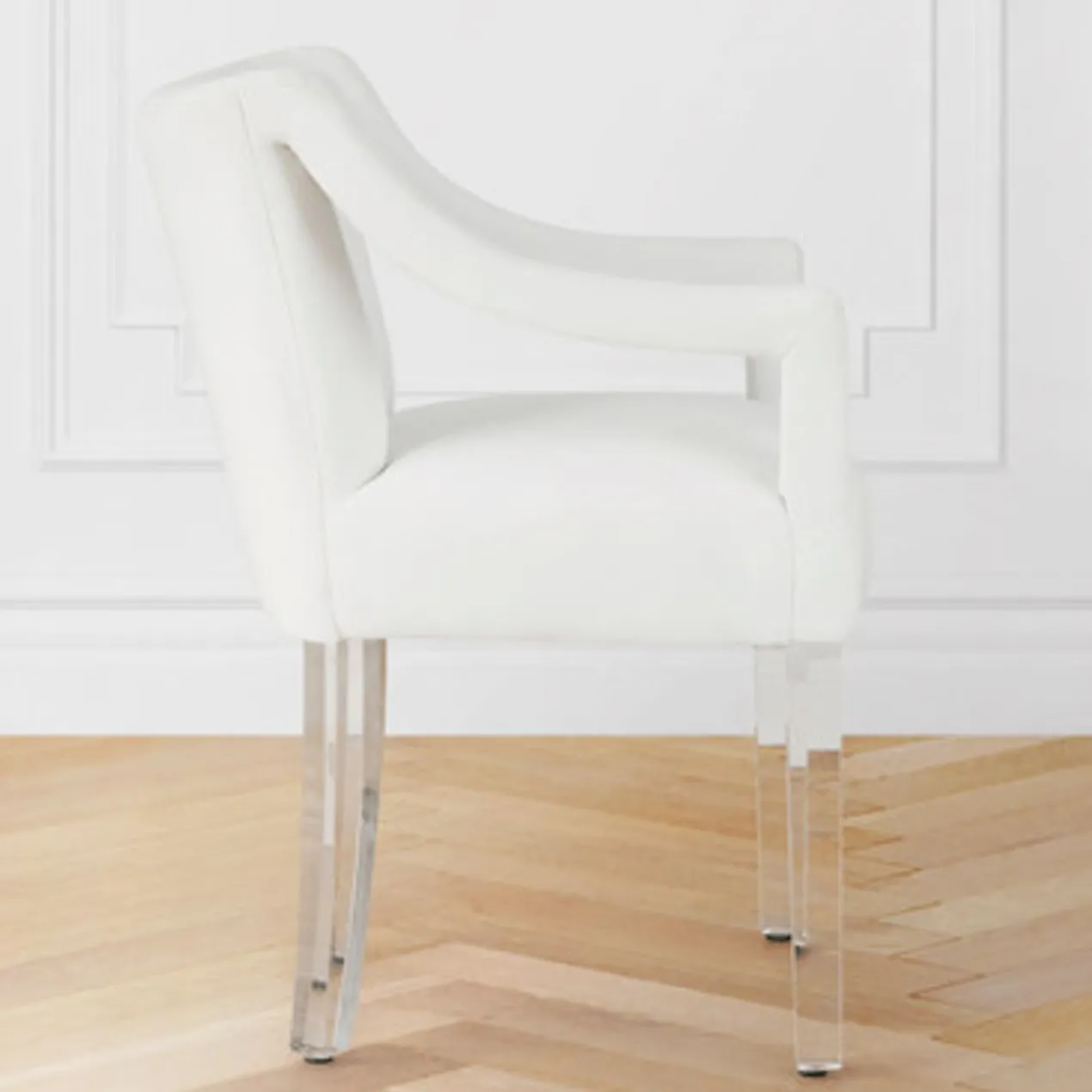 Sure to be a standout in any room, our Aubrey chair is framed in kiln-dried hardwood with gently sloping, cutout arms, neatly tailored upholstery, and clear acrylic legs for a luxe, unexpected finishing touch. Shown in Bella Velvet White.