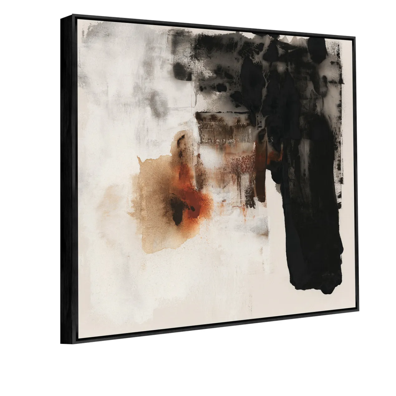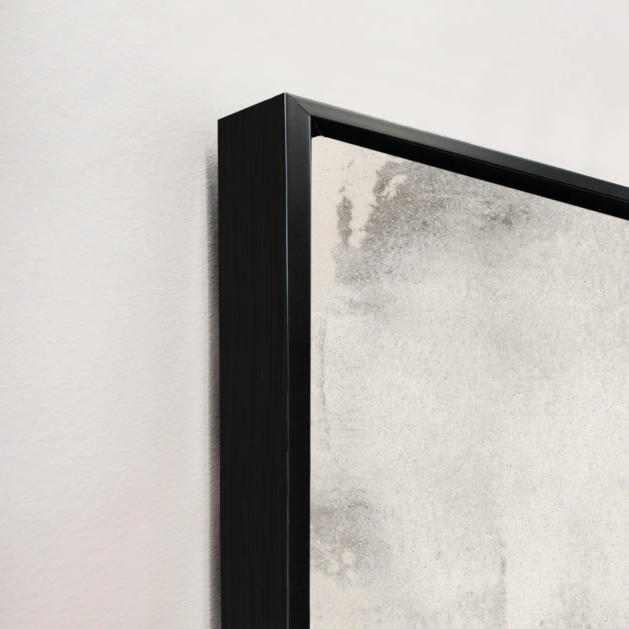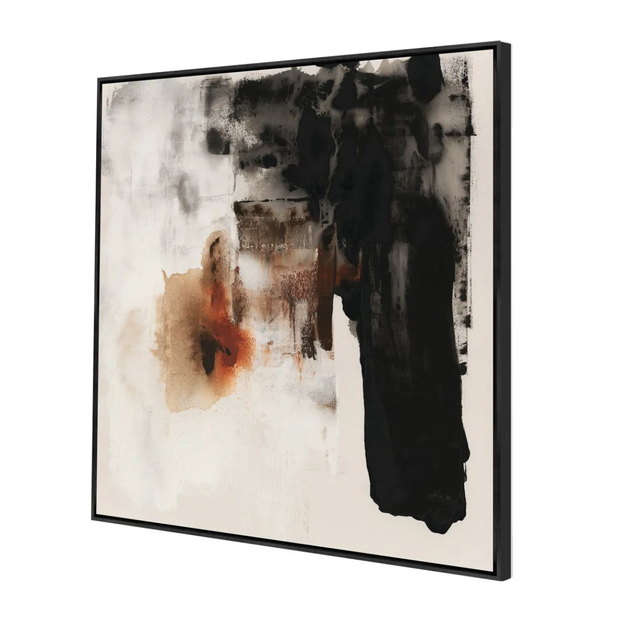 Gallery-wrapped canvas with hand applied image brush gel. Set in a black floater frame.