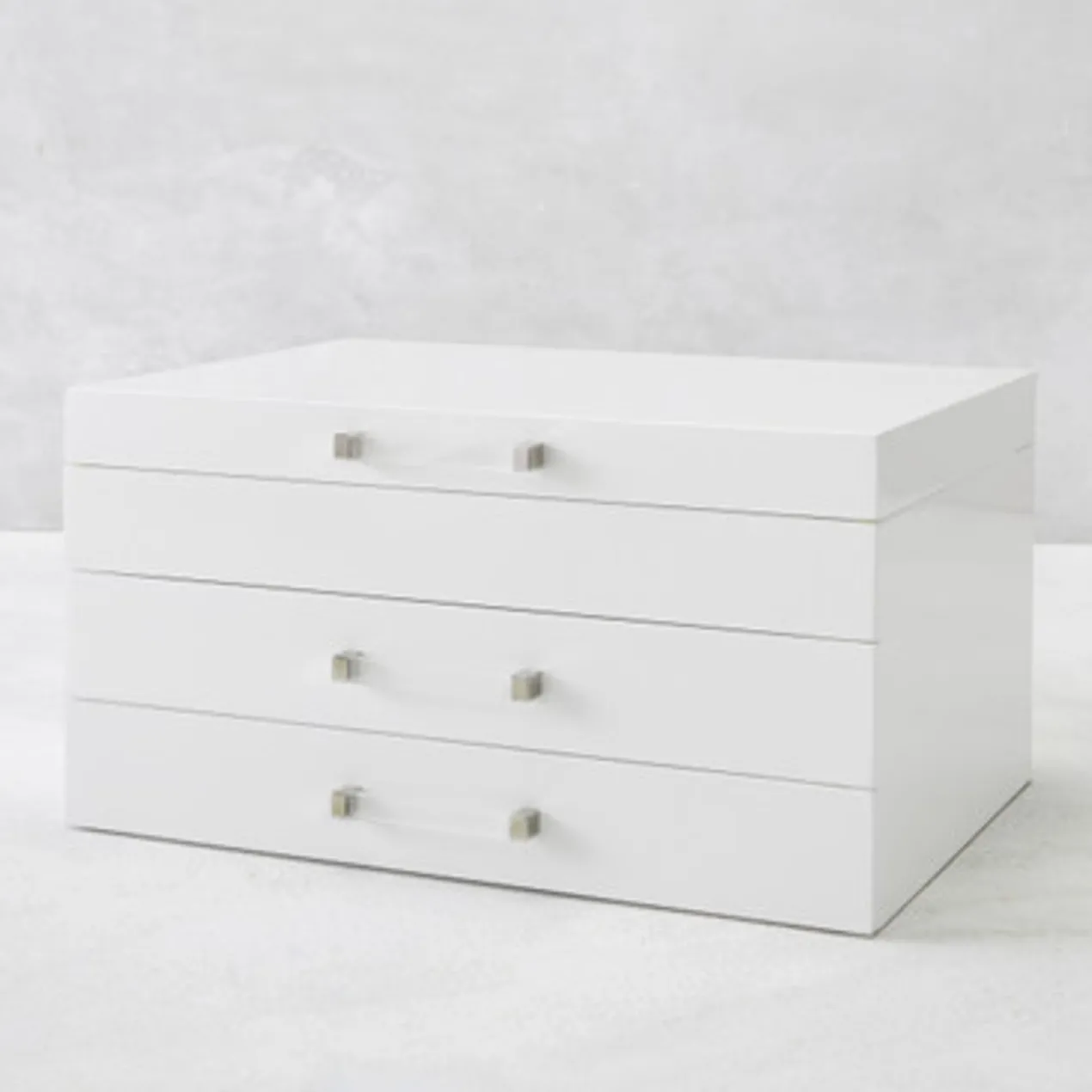 A jewelry box for serious collectors, our largest has two drawers for bracelets and pendants. A top tray features compartments for immediate needs. Clear acrylic handles add a touch of chic style.