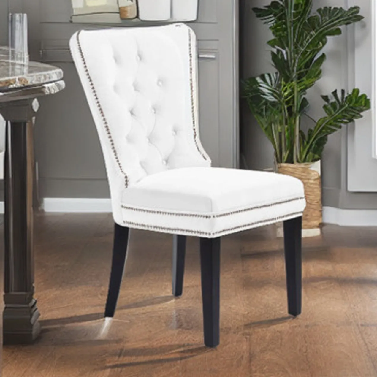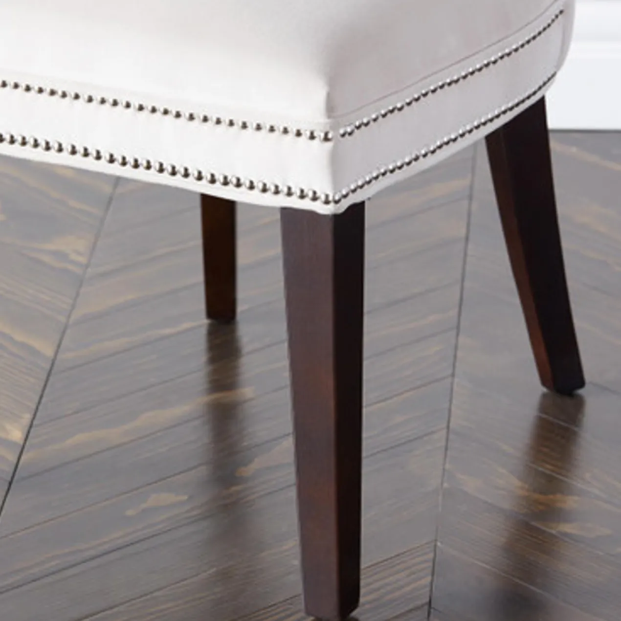 With its gentle curving silhouette, our sophisticated Charlotte Dining Chair effortlessly elevates the style of any room. Plush upholstery and hand-applied nail head details atop wooden legs make our Charlotte Dining Chair both refined and versatile. A pull ring matching the nailheads adorns the back of each chair. Shown in Bella Velvet Pearl with bright nickel nailheads.