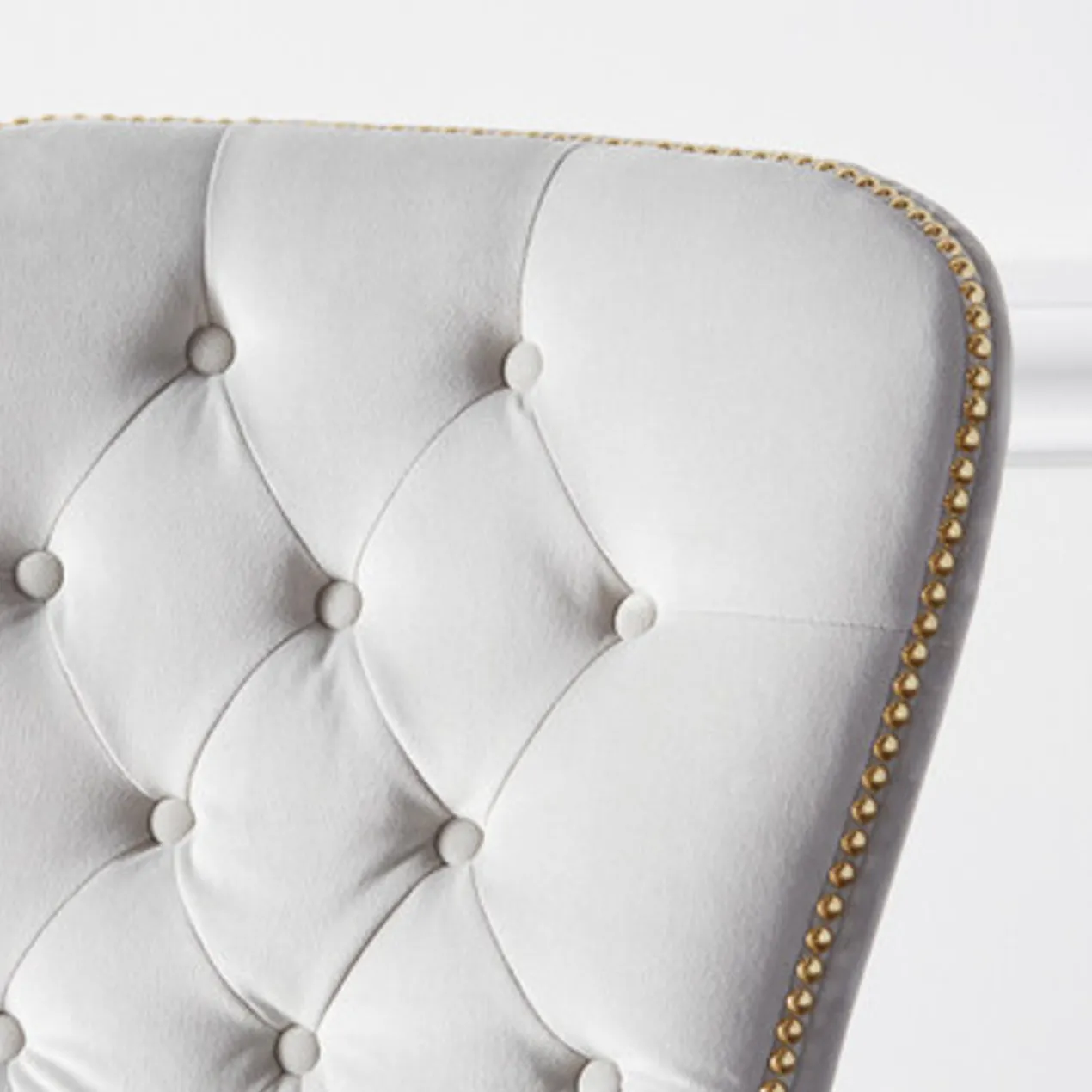 With its gentle curving silhouette, our sophisticated Charlotte Dining Chair effortlessly elevates the style of any room. Plush upholstery and hand-applied nail head details atop wooden legs make our Charlotte Dining Chair both refined and versatile. A pull ring matching the nailheads adorns the back of each chair. Shown in Bella Velvet Dove with golden nailheads.