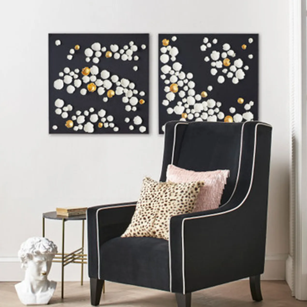 Resembling a starry sky, this artful arrangement of white and gold sculptural elements is mounted on black fabric and displayed in an acrylic shadowbox frame.