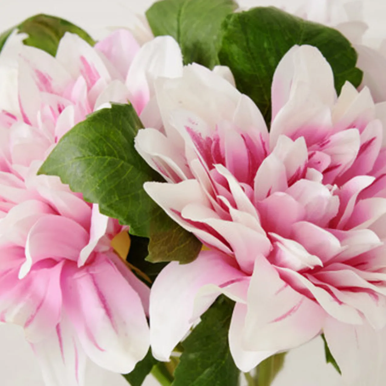 Housed in a glass vase, this stunning faux-dahlia arrangement will look lush and lifelike all year long. Still “water” adds a realistic touch.