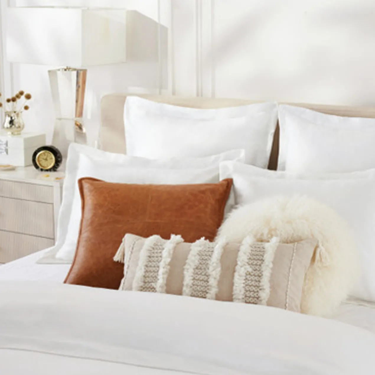 A sleek and stylish accent for the sofa, this pillow is crafted of supple leather with double-stitched panels, self-welt trim, and a solid cotton back. A feather-and-down insert ensures long-lasting comfort.