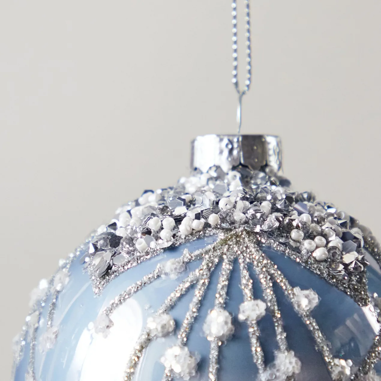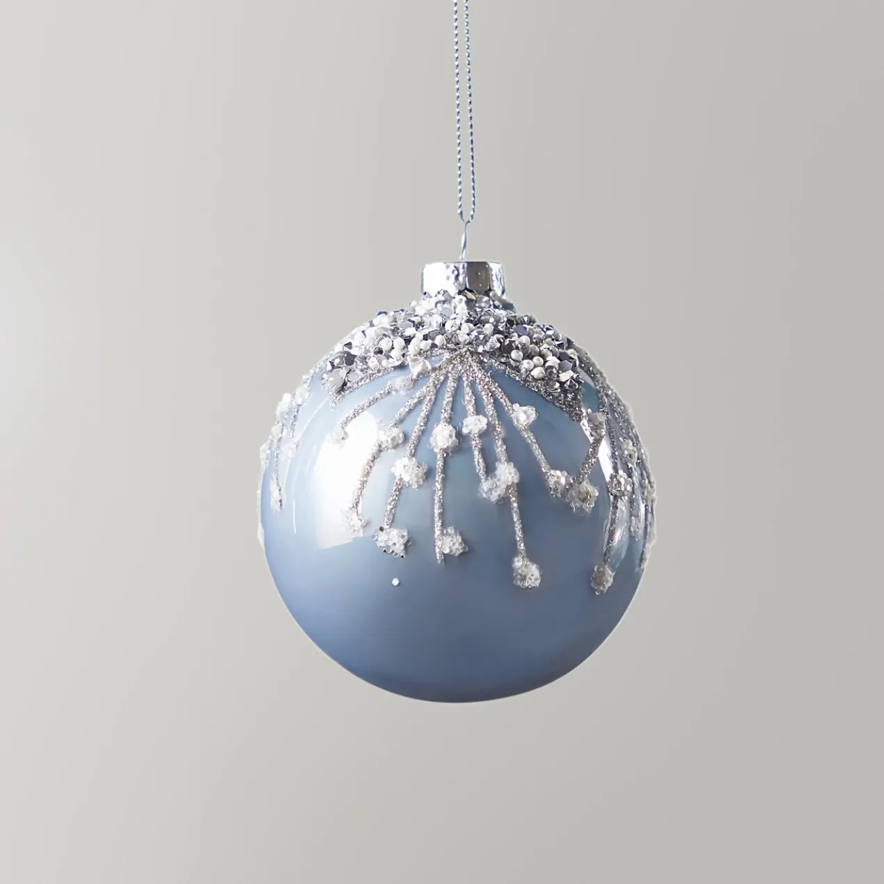 Perfect your holiday glam with this highly embellished ornament in a soft blue color and beaded details.