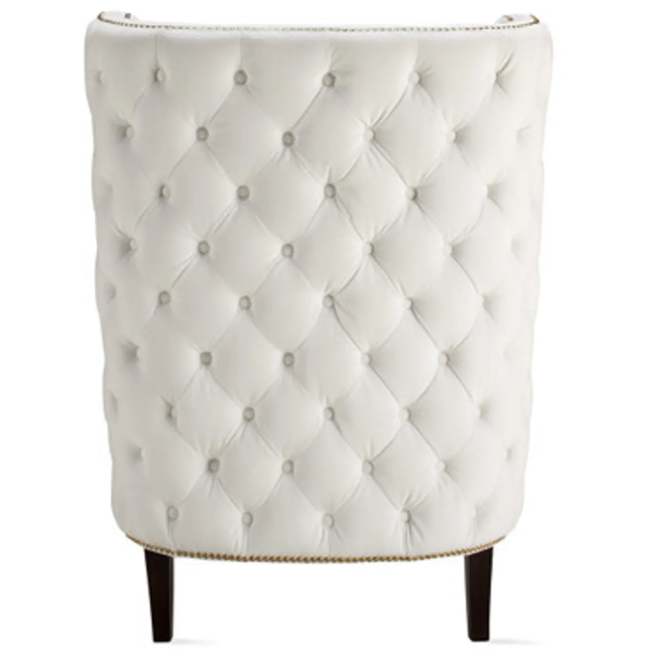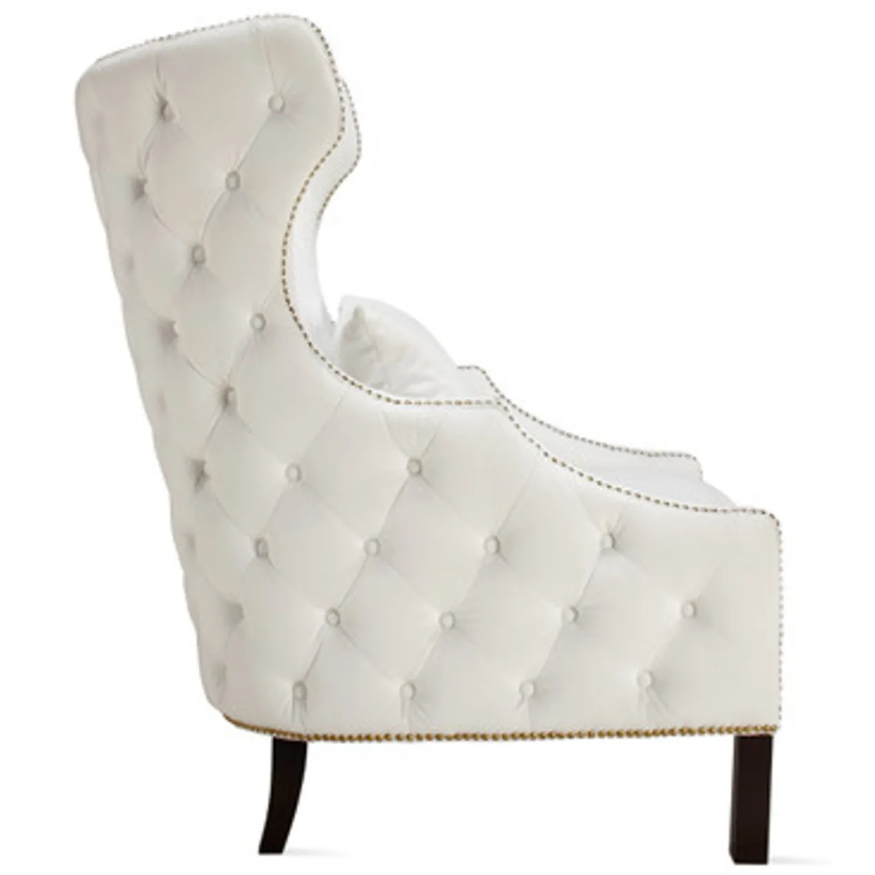 Double rows of hand-applied nailhead trim accentuate the curvy silhouette of our Exeter accent chair. Featuring a modern wingback frame with notched arms and button tufting on the exterior seat back, its generous proportions, ample padding, and removeable lumbar pillow ensure this piece is as comfortable as it is stylish. Shown in Bella Velvet White with golden nailheads.