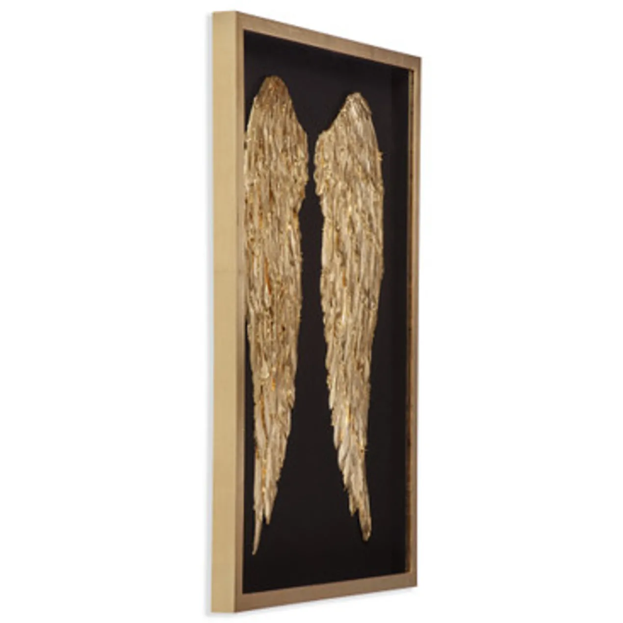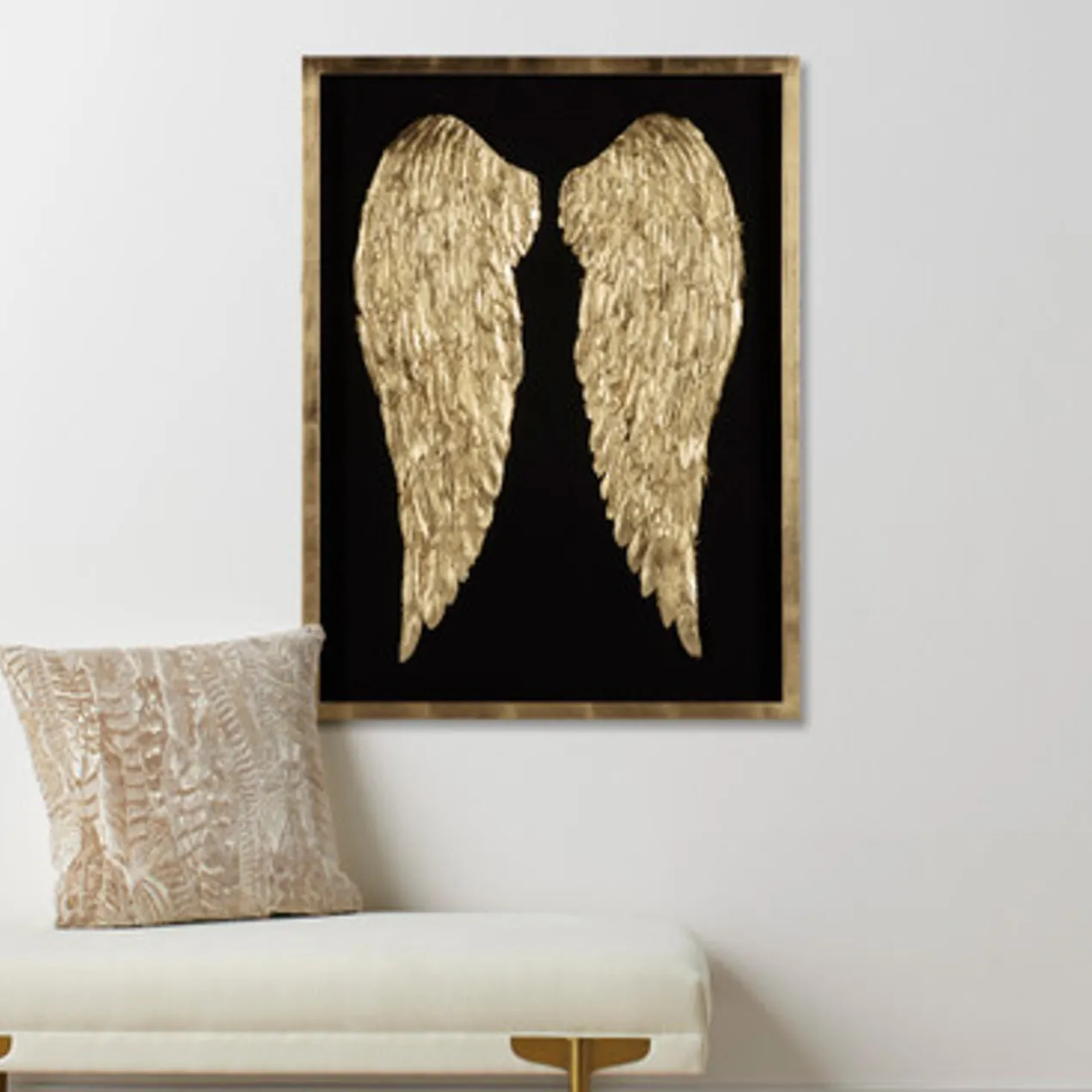 Perfect for adding texture and shine to your wall, this graceful, angelic arrangement of hand-painted feathers is mounted on black linen and displayed in a gold shadowbox frame.
