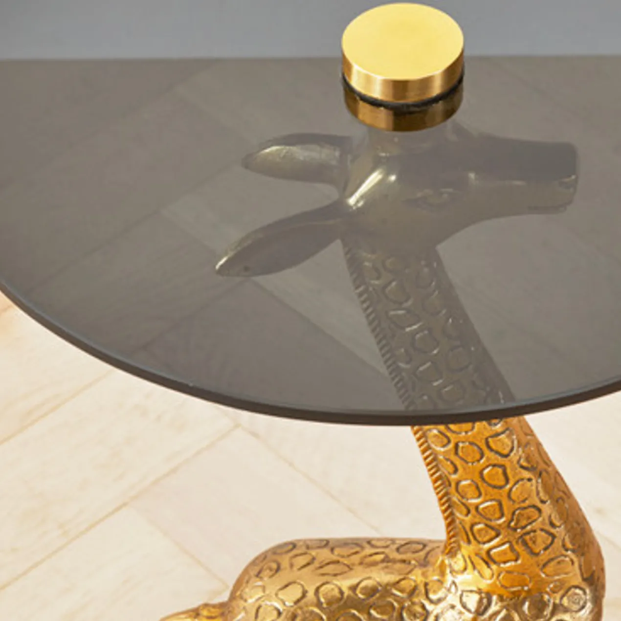 A sleek, modern addition to any decor, this accent table features a smoked glass top and an intriguing gold-finished base in the shape of a giraffe.