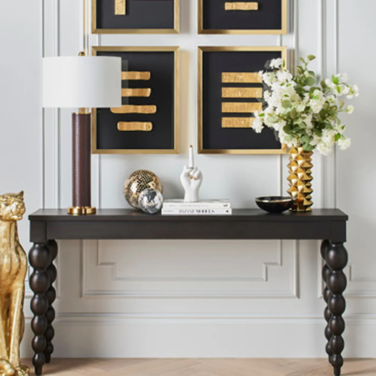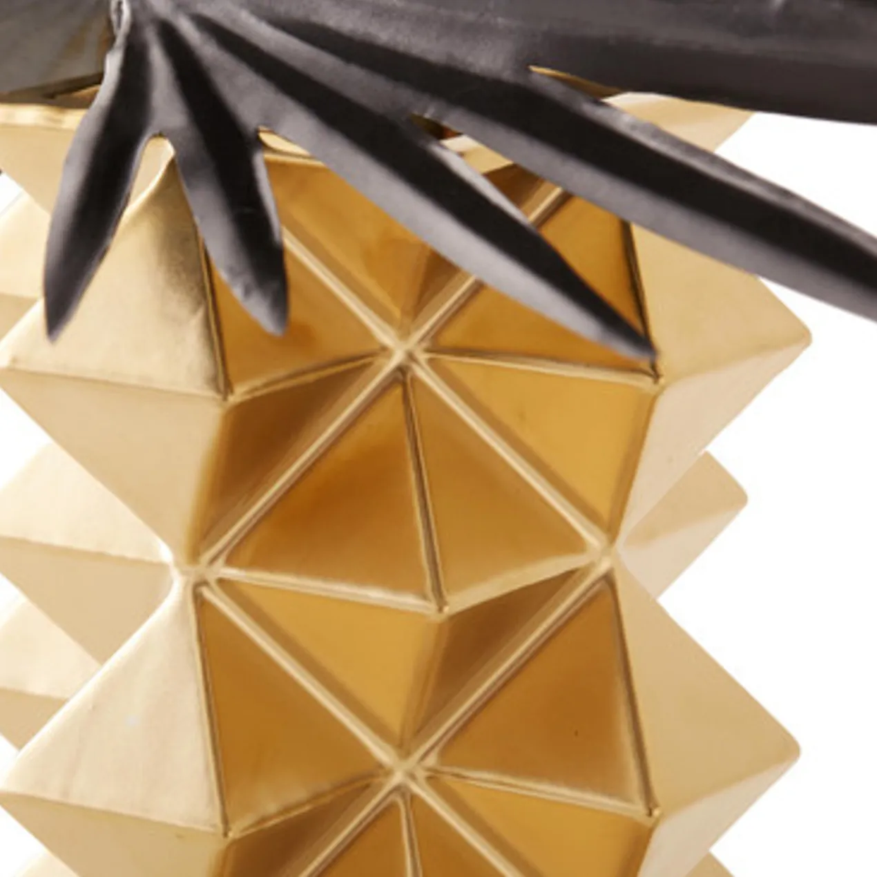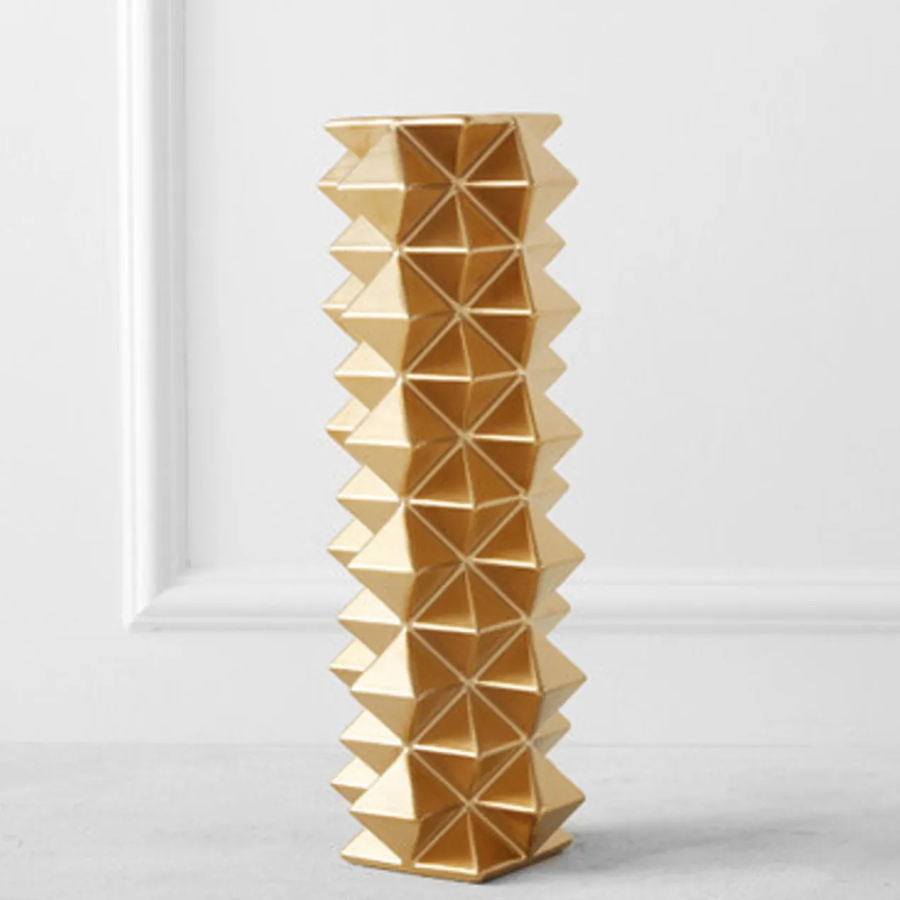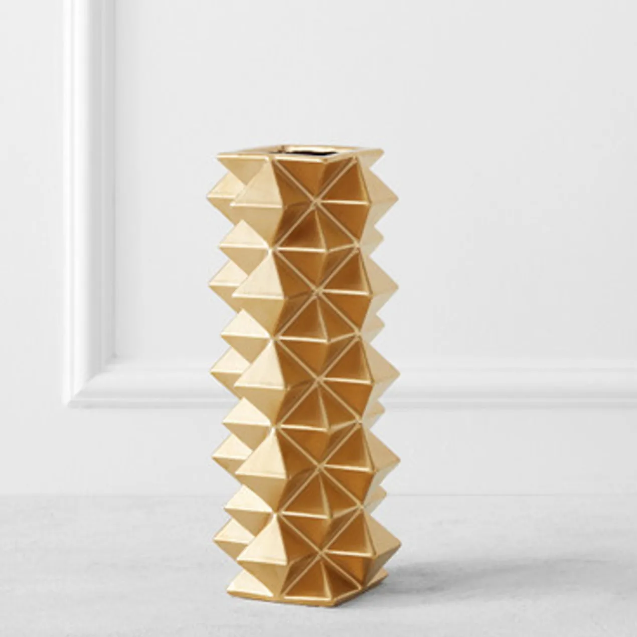 An eye-catching addition to the shelf, this vase is crafted of ceramic with a dimensional pyramid design and gold finish.