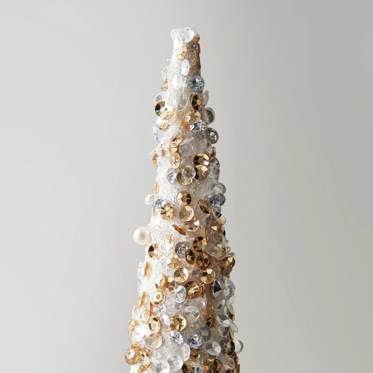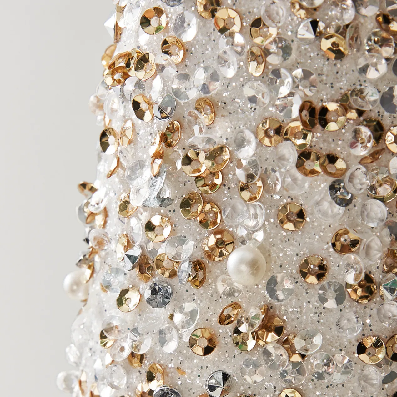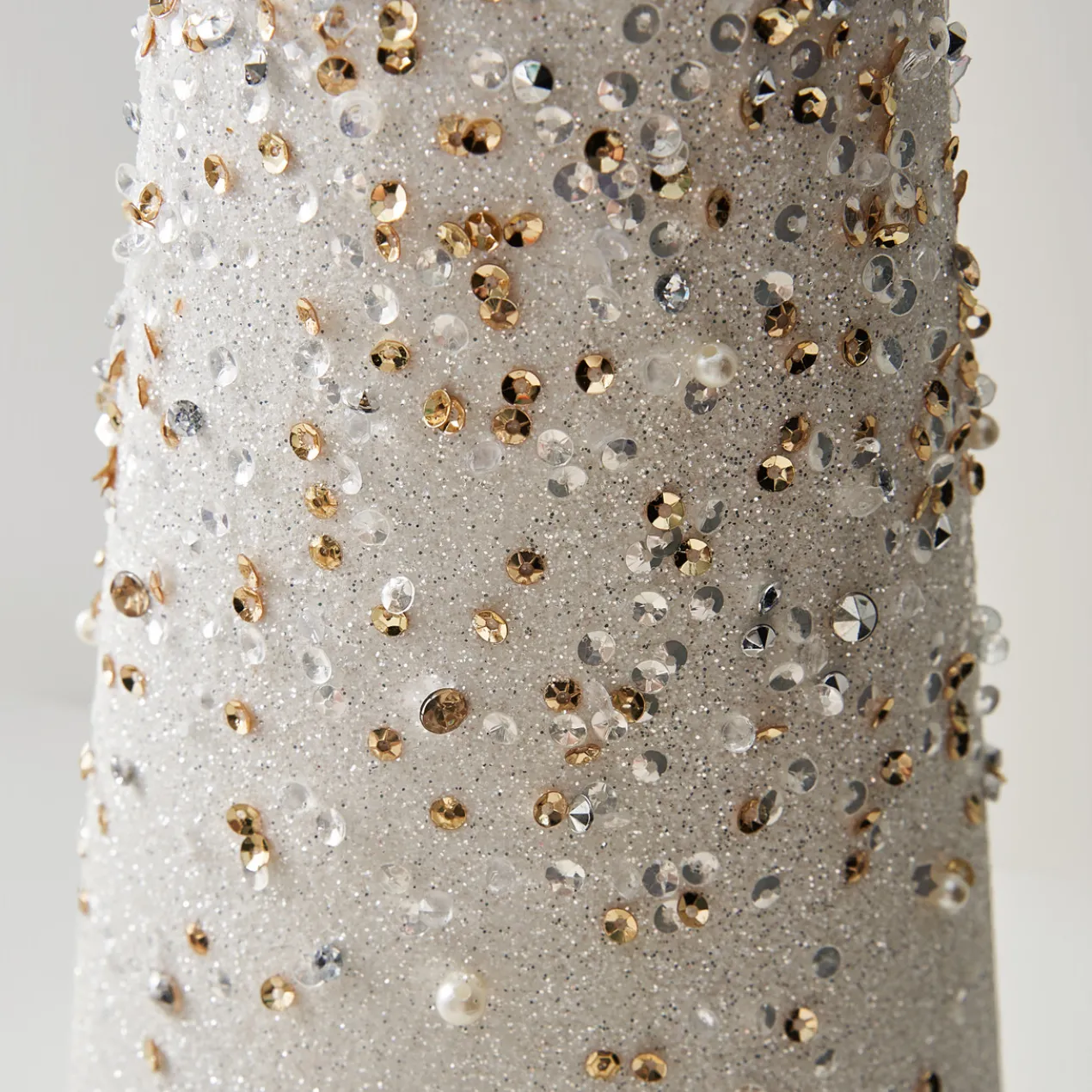 This set of two shimmering cone trees will add elegance to your holiday decor. Embellished with glitter, sequins, and pearls, these white and gold ombre trees are perfect to enhance a shelf or act as an eye-catching centerpiece.