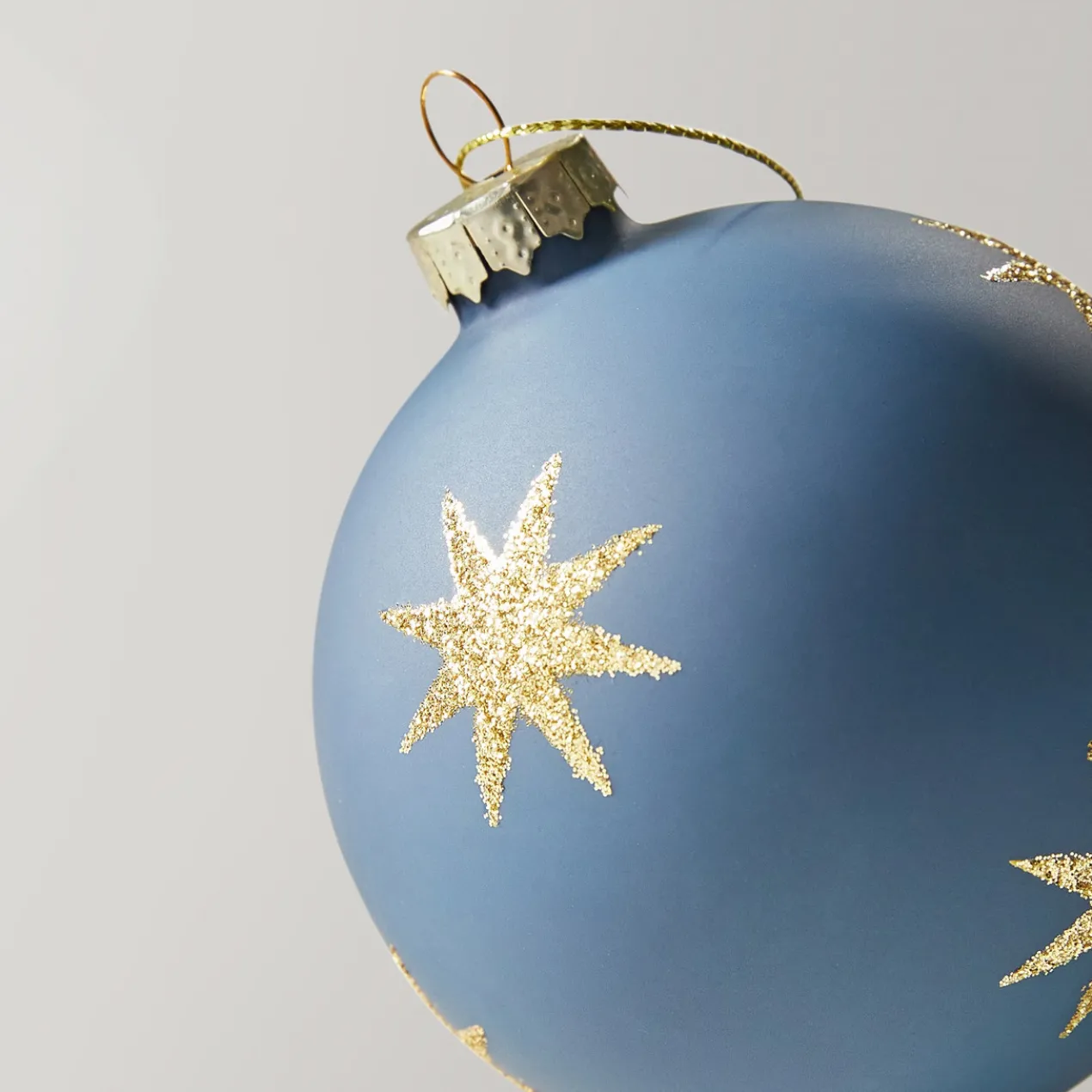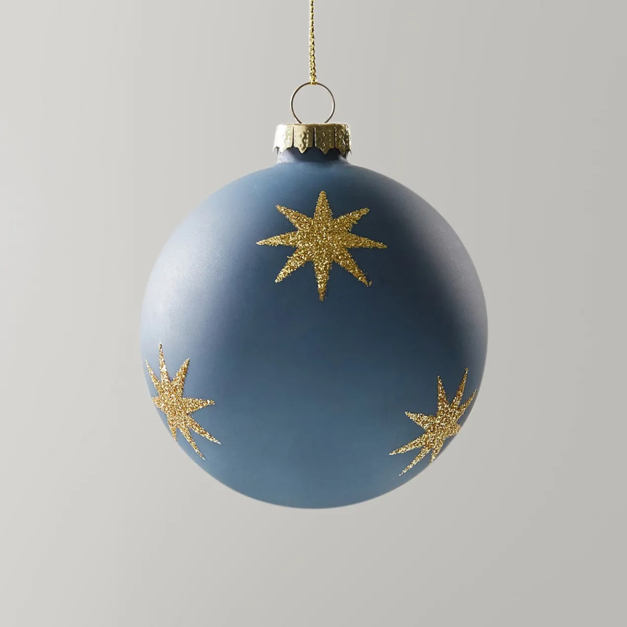 Add a celestial vibe to your holiday decorating with this glittered star ornament in a stunning shade of blue.