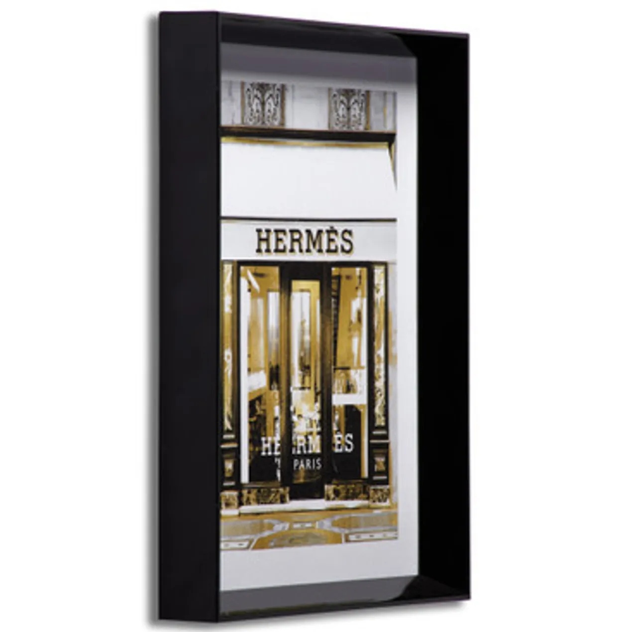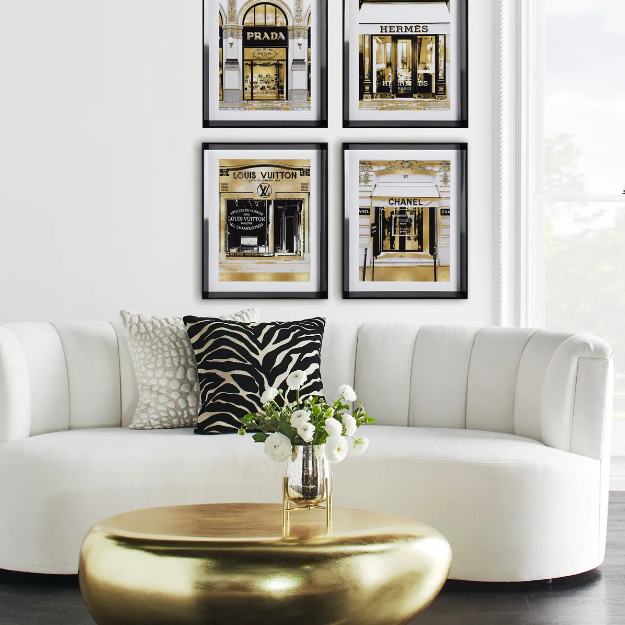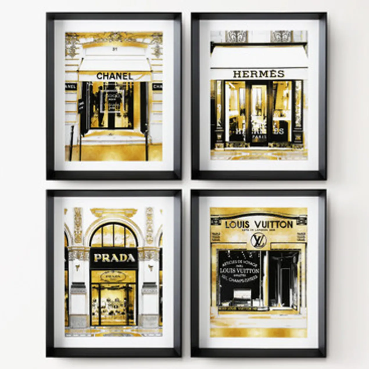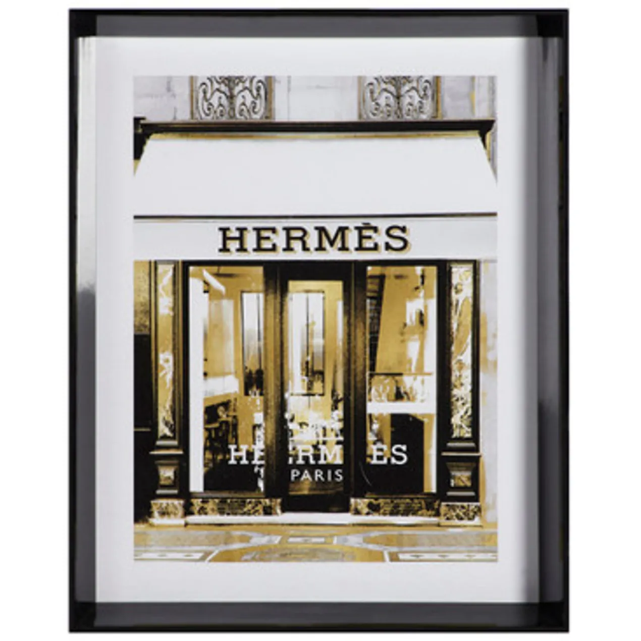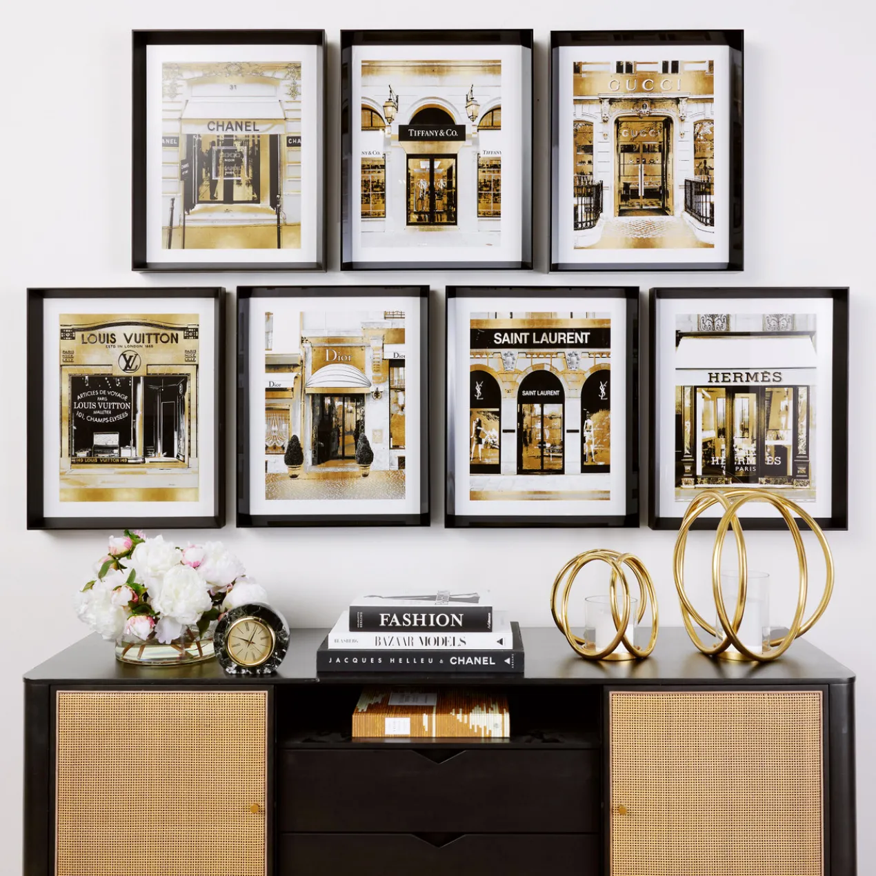 Ideal for adding a luxe note to your space, the glam storefront prints in this series are rendered in black, white, and gold and come beautifully framed.