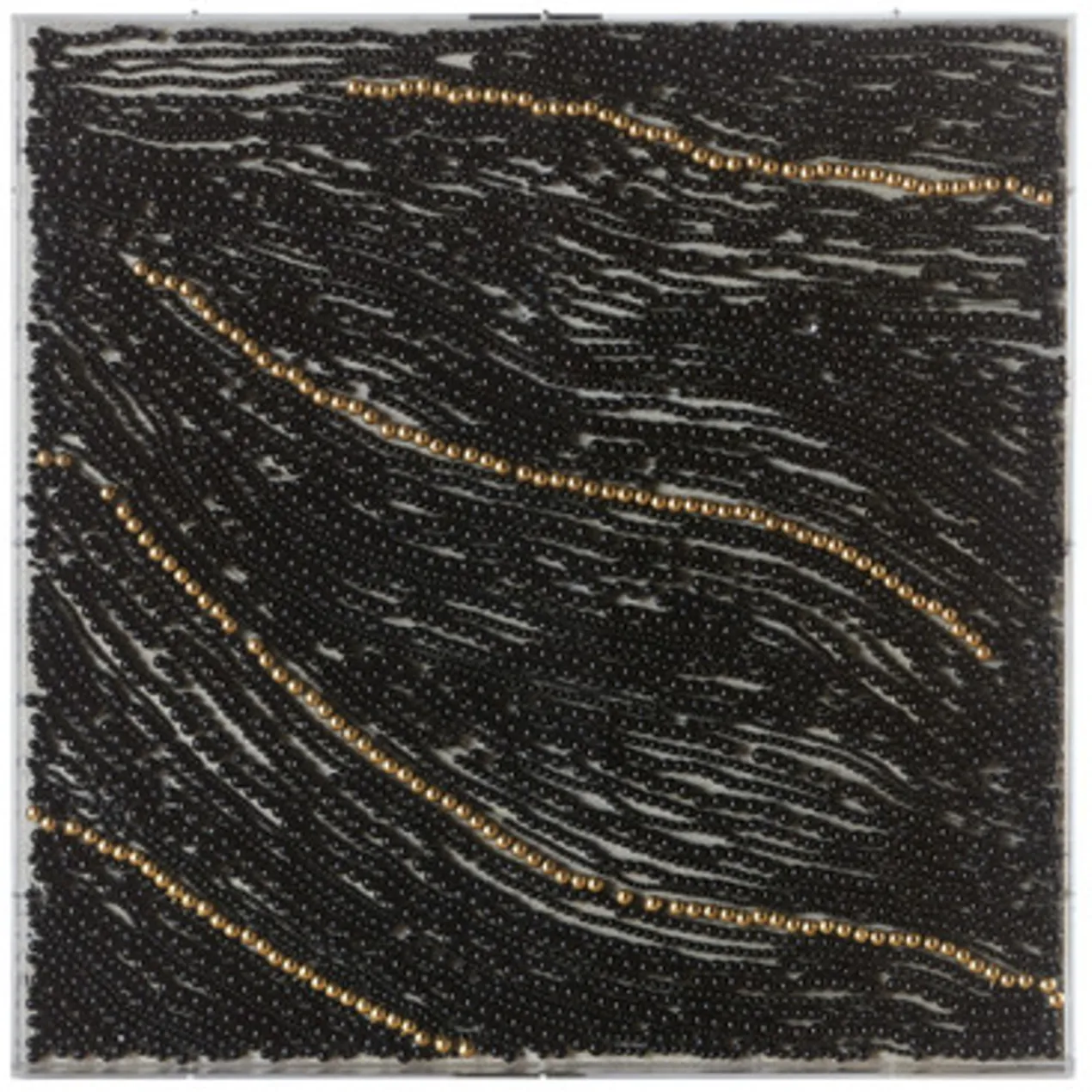 Perfect for adding texture, drama, and shine to your wall, this captivating composition features strands of black and gold beads displayed in a clear acrylic shadowbox frame.