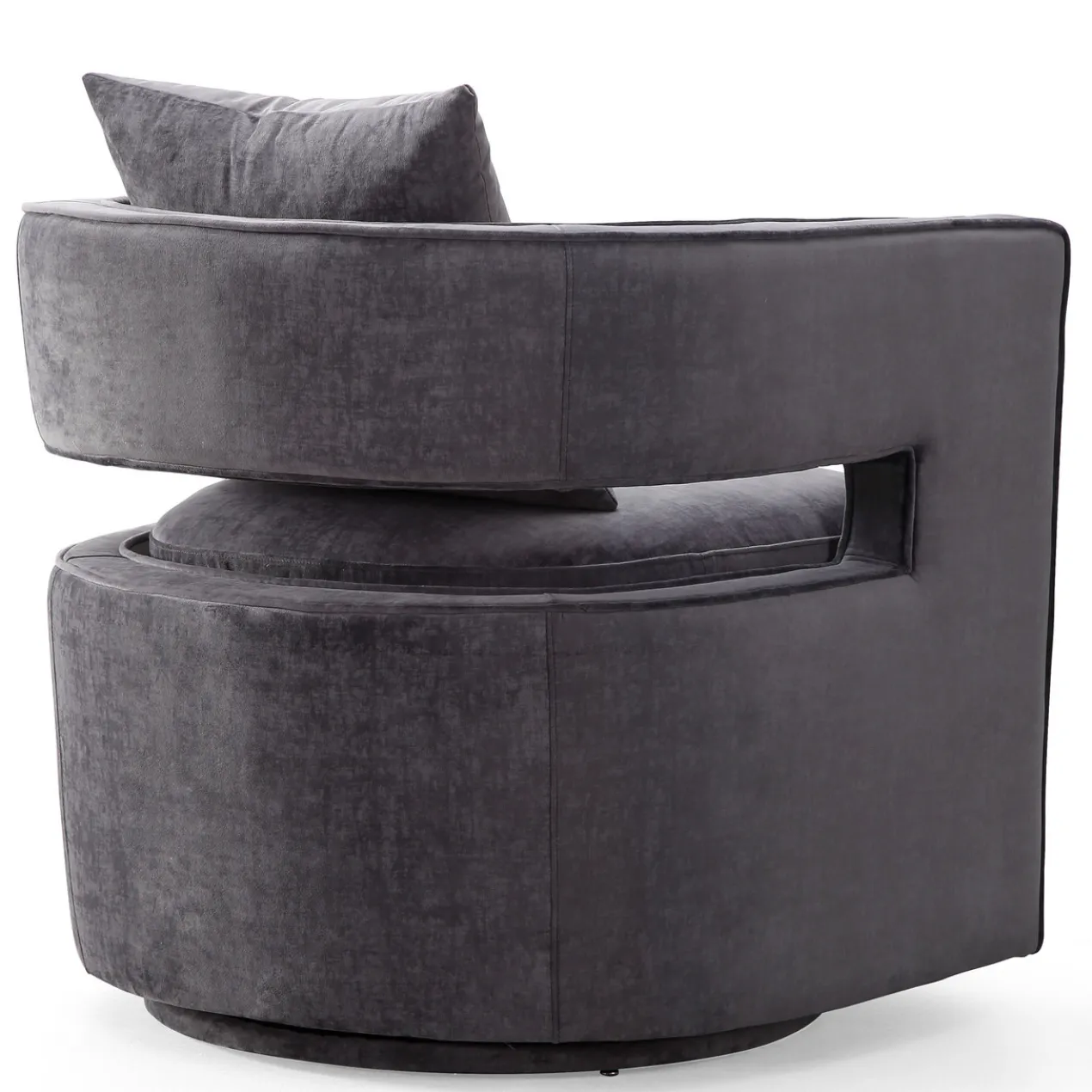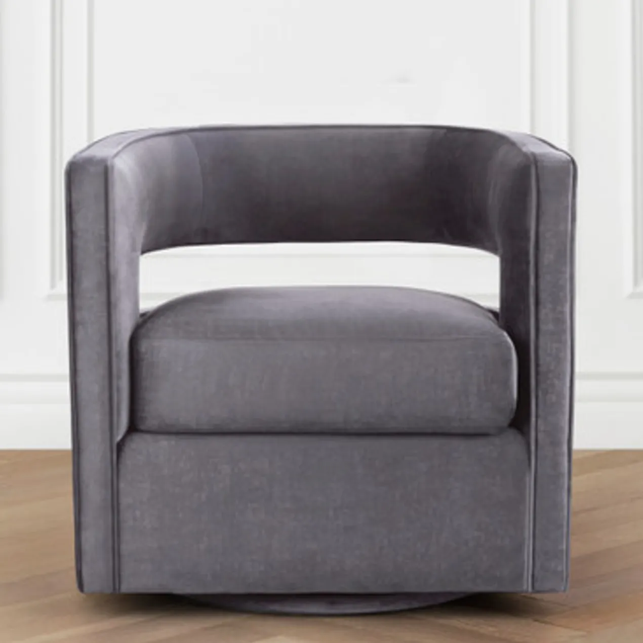 With its barrel back, cutout arms, and Grey velvet upholstery, this swivel chair adds instant glamour to a room. A kiln-dried frame and plush foam-and-fiber fill ensure long-lasting comfort and support.