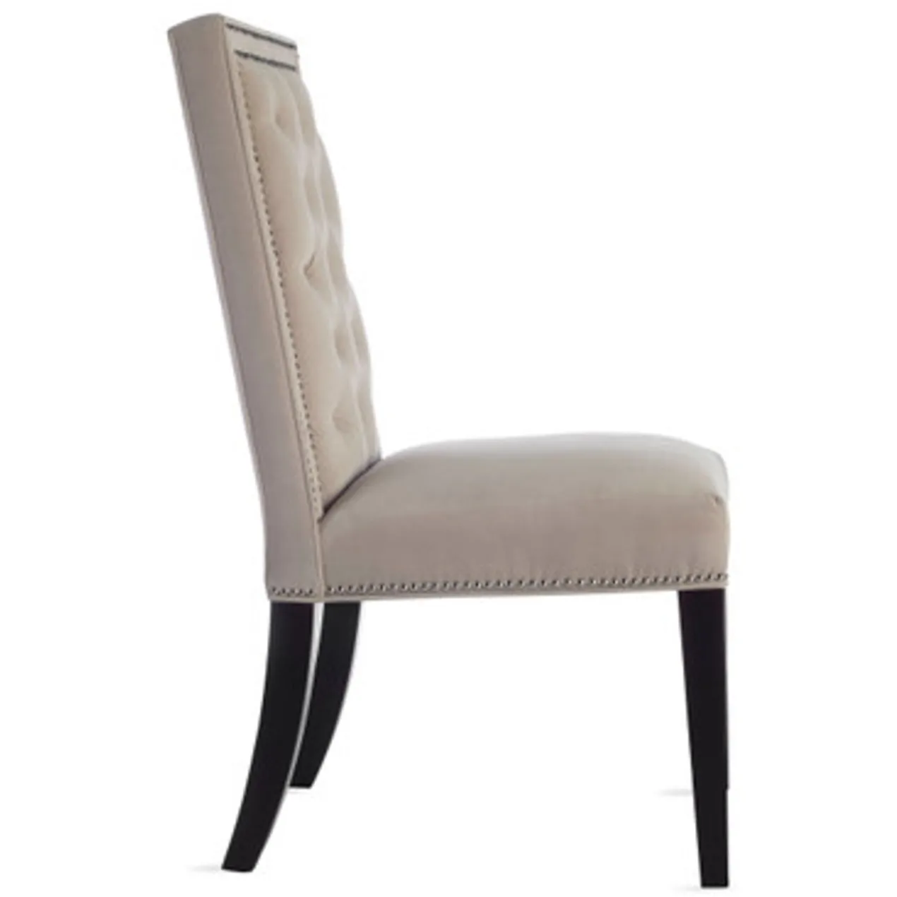 Maxwell, a modern dining chair, features deep tufts for a more tailored look, making it the perfect option for everyday use. Shown in Bella Velvet Pearl with bright nickel nailheads.