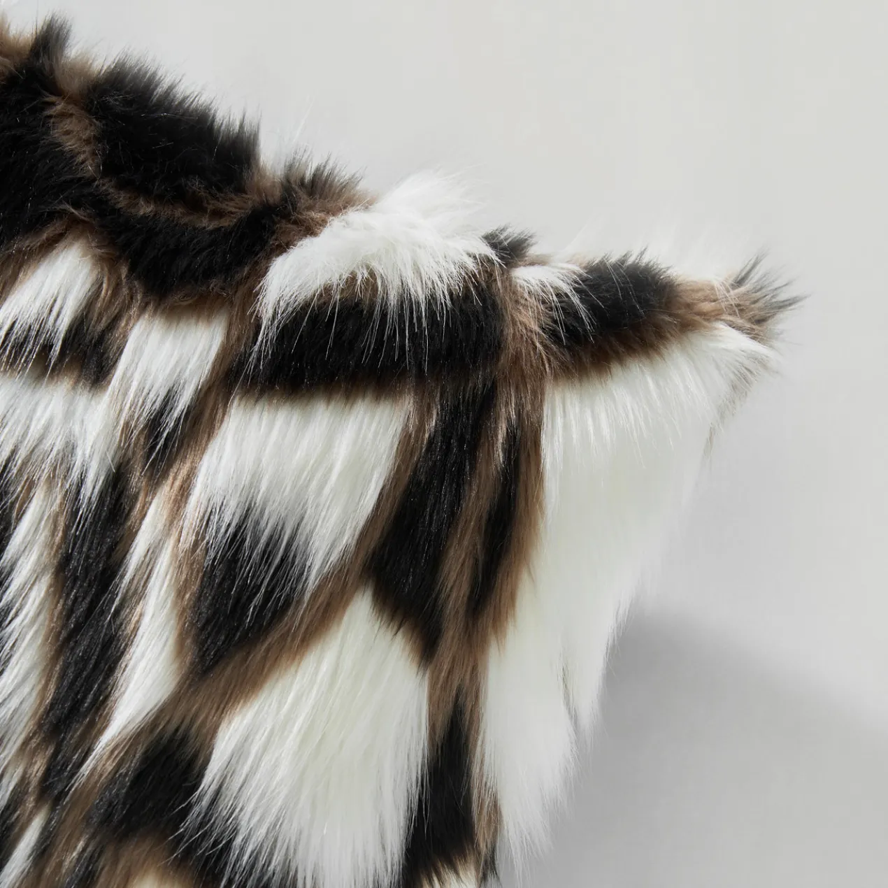 Our Neve faux fur pillow boasts an exceptionally soft feel. Featuting a spotted black, brown and white design. It beautifully captures the warmth and opulence of genuine fur, while delivering unmatched comfort and timeless elegance.
