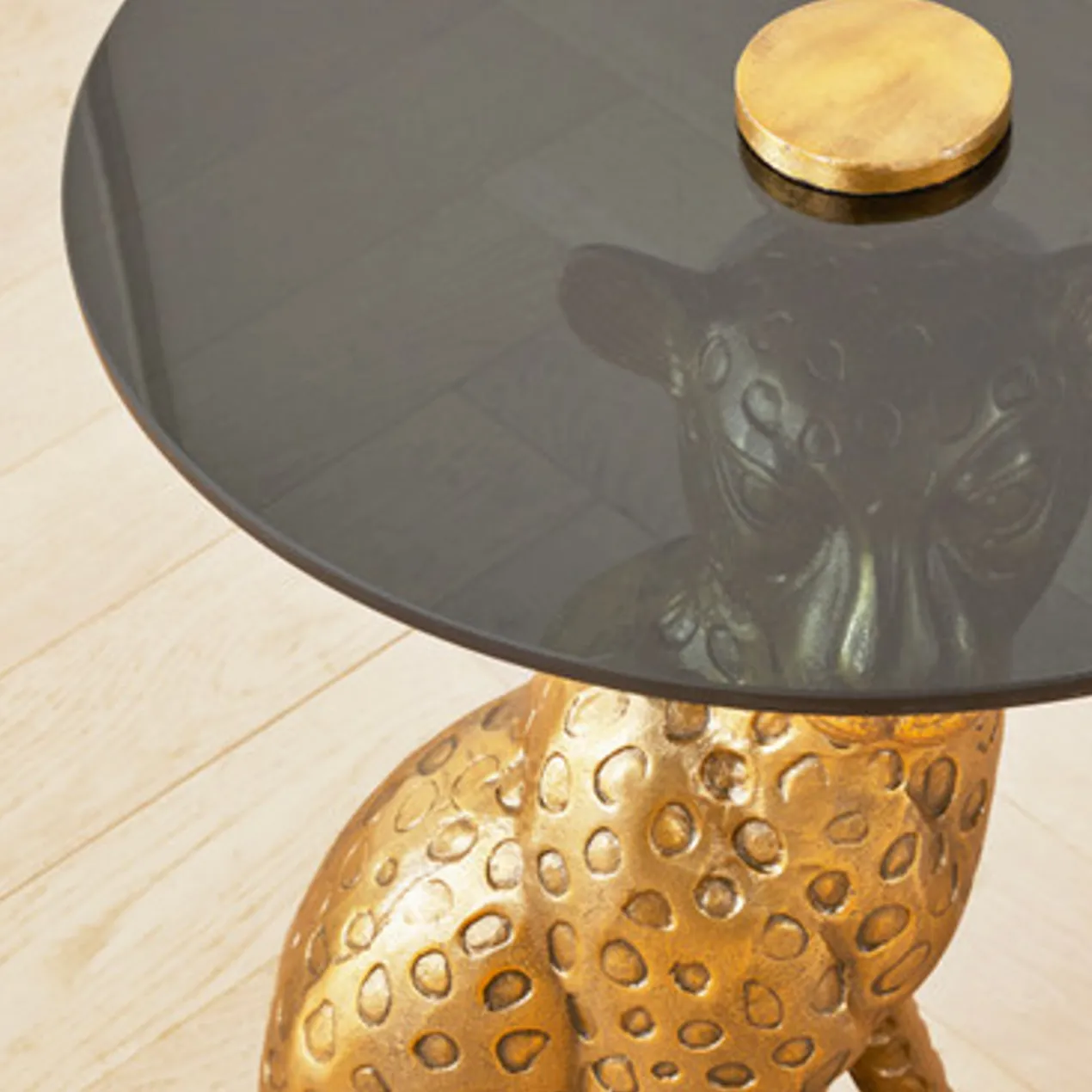 A sleek, modern addition to any decor, this accent table features a smoked glass top and an intriguing gold-finished base in the shape of a cheetah.