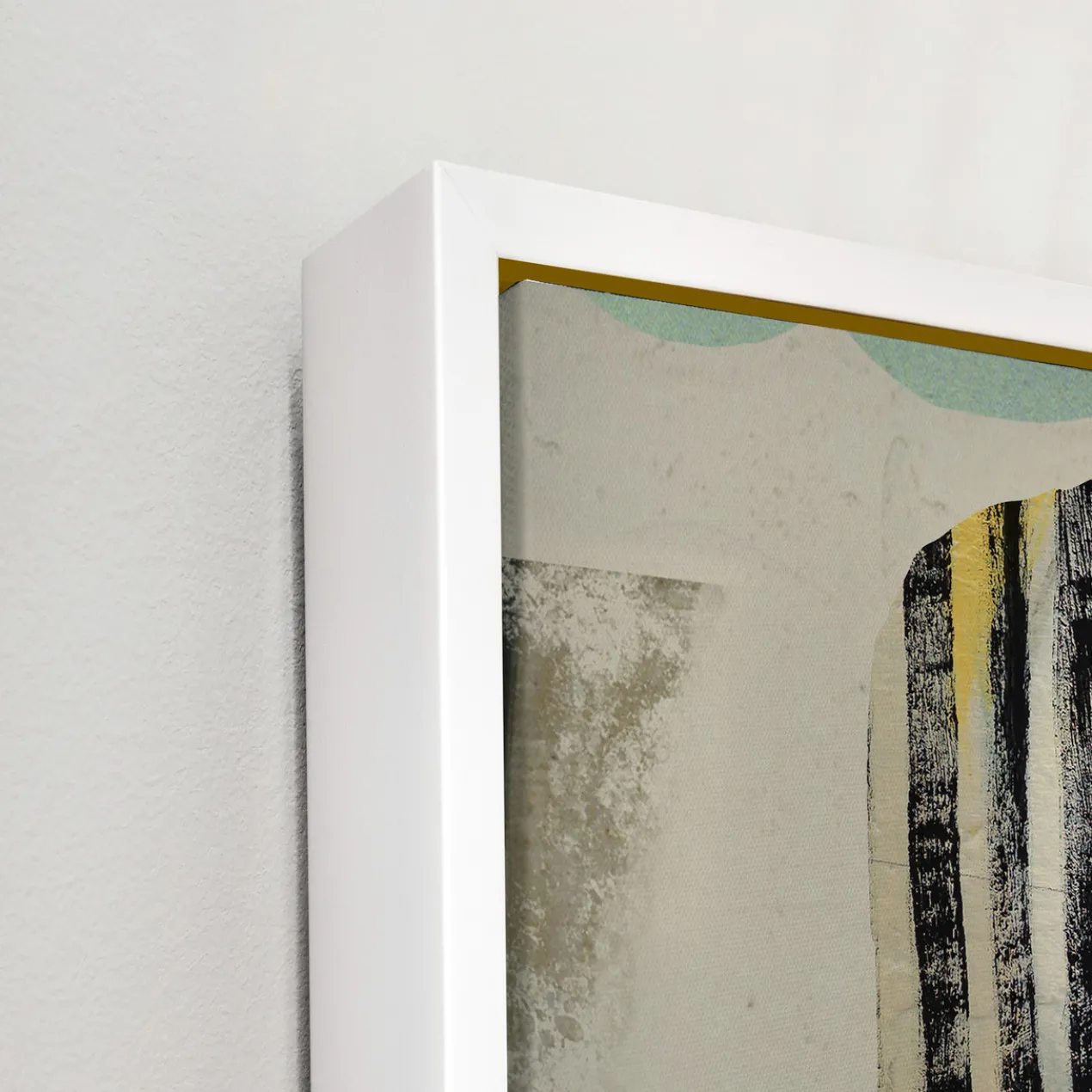 - Set in a white floater frame.