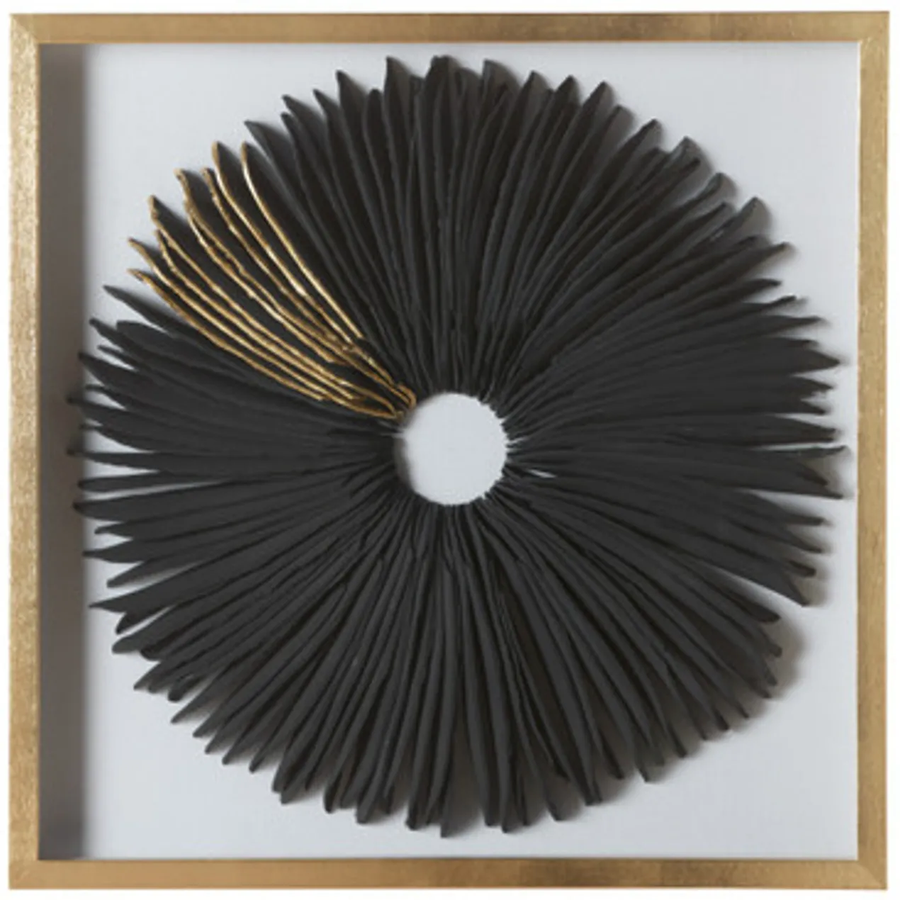 Featuring hand-sculpted clay arranged in a circular pattern with gilded accents, this dimensional work adds an incredible element of texture and shine to the wall. Displayed under glass in a gold shadowbox frame.