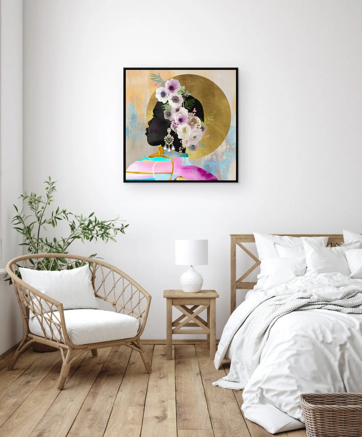 Gallery-wrapped canvas with gilded gold accents and hand-applied image brush gel finish.