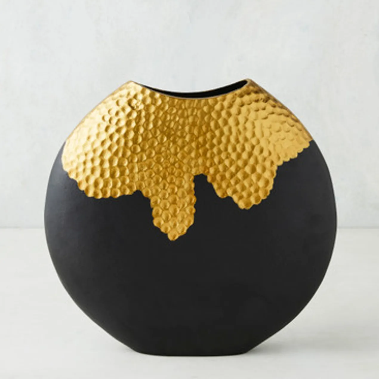 Whether it’s displaying blooms or serving as a decorative accent piece, this black-and-gold vase makes a statement on any shelf.