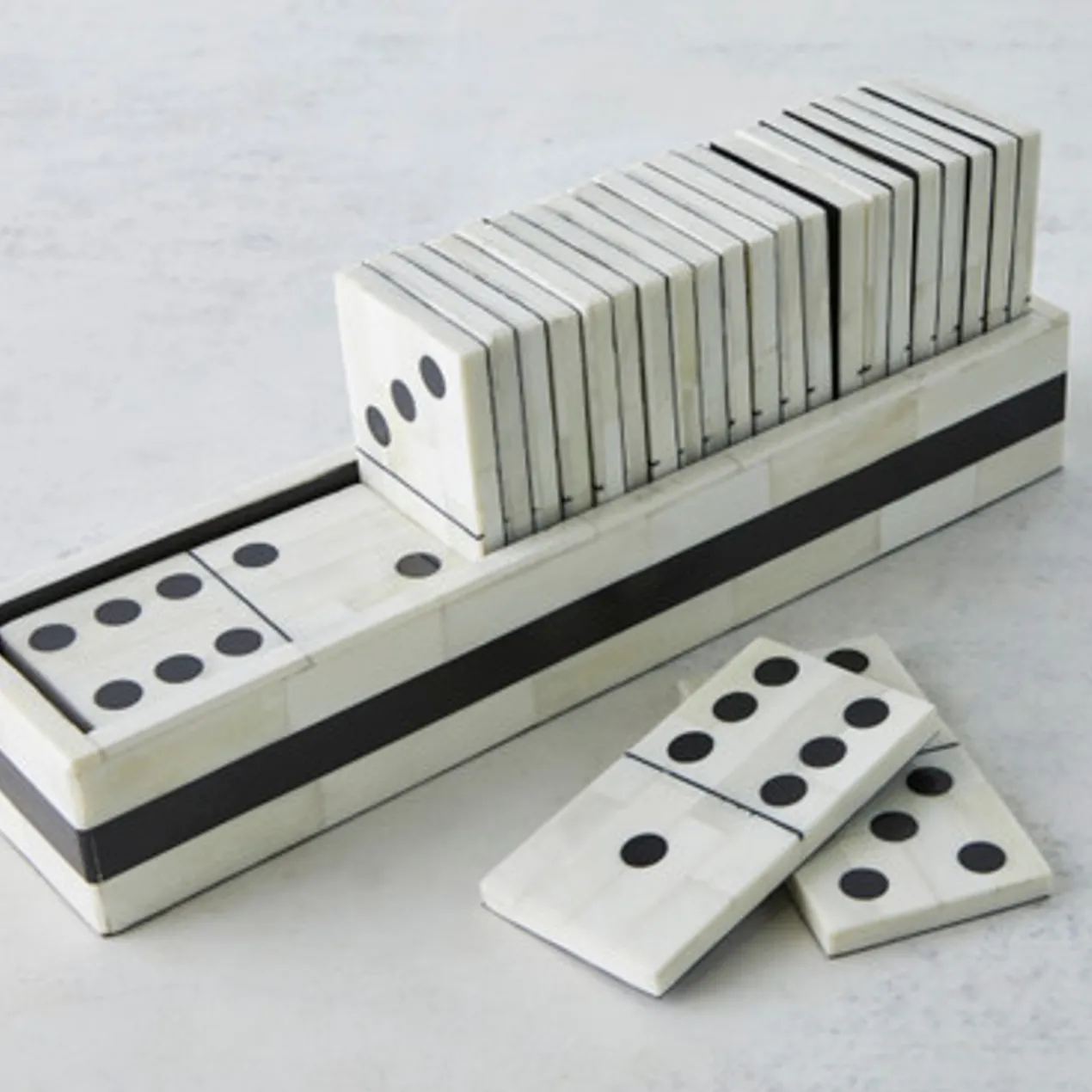 Beautifully inlaid with bone tiles and set in a coordinating holder, this oversized dominoes set is chic in play or on display.