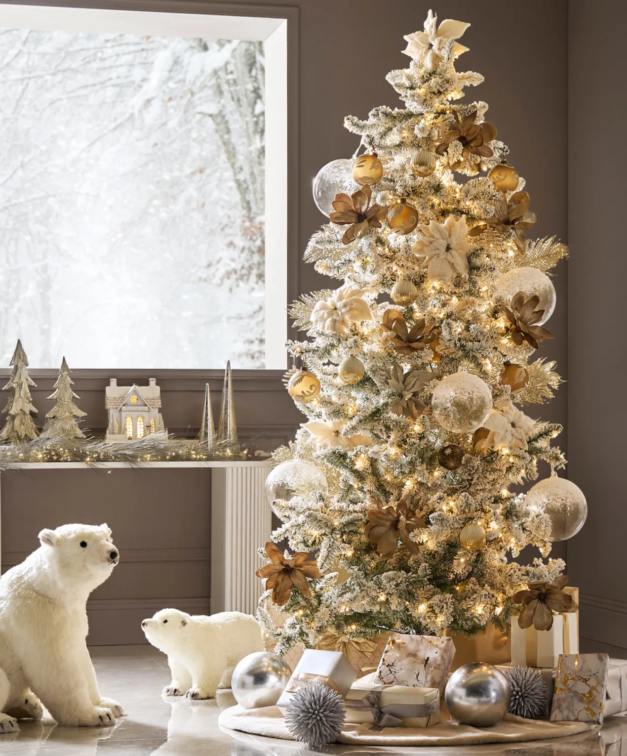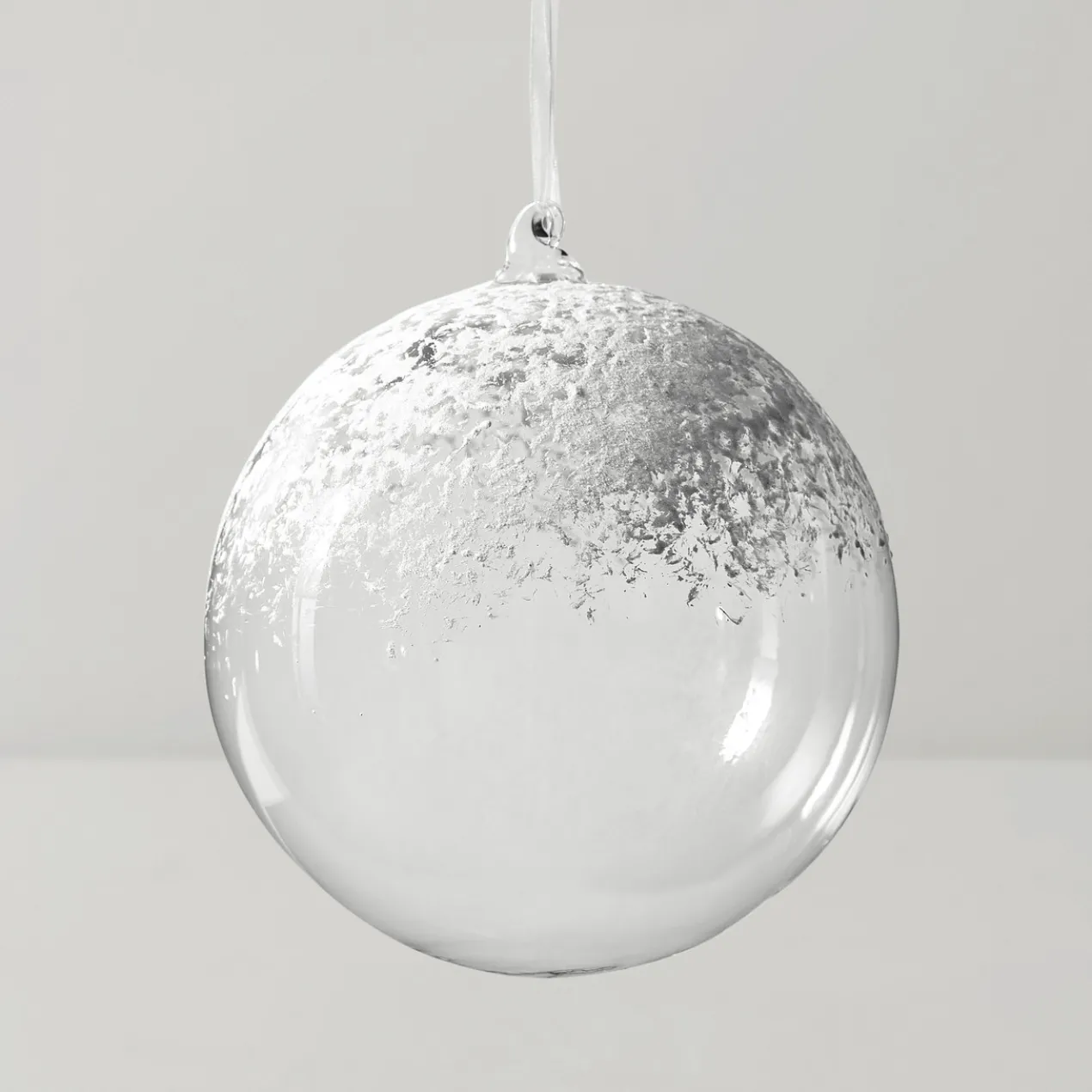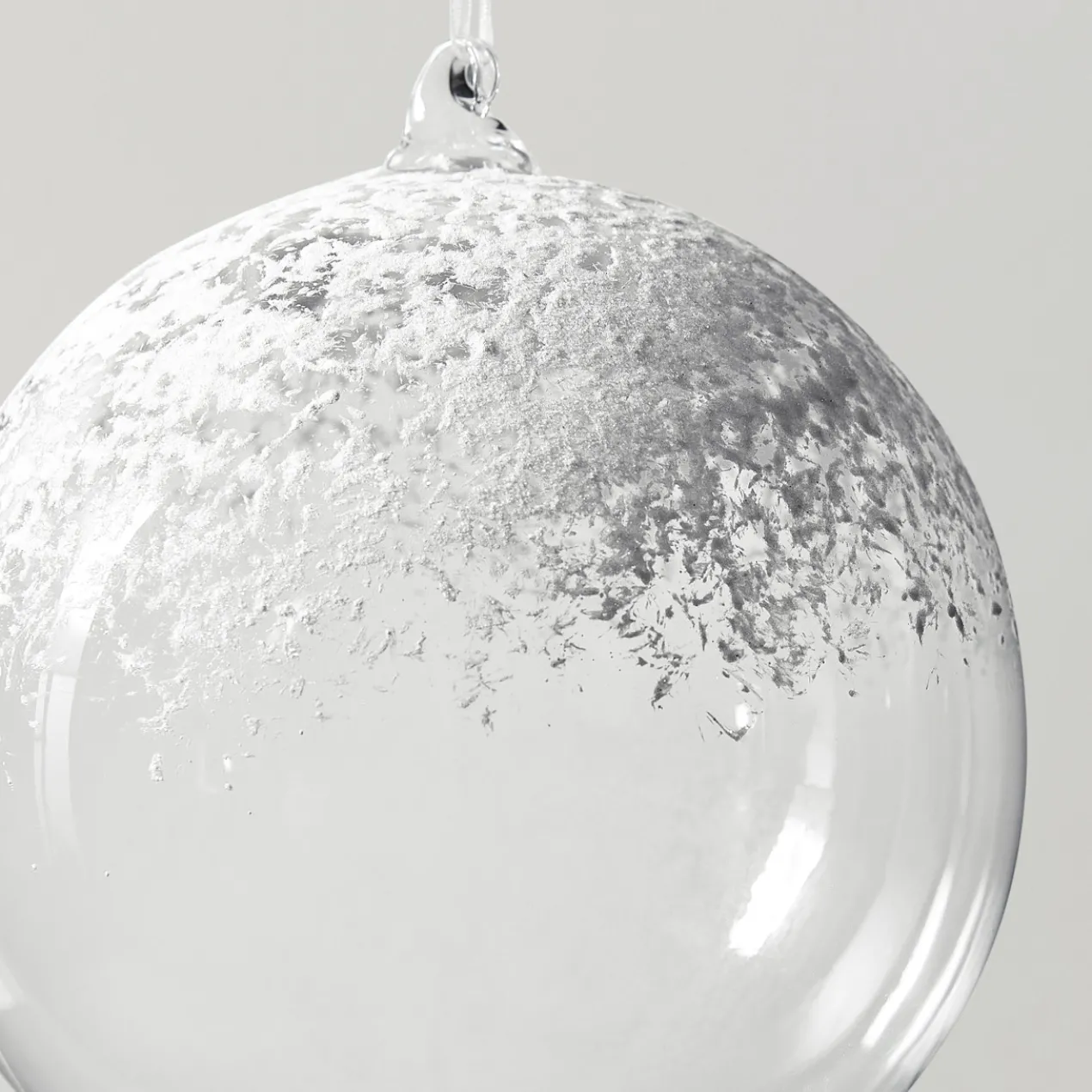 Oversized ornaments are our favorite way to add subtle drama to your tree. Clear glass finished with a dusting of snow sets the scene for your winter wonderland.