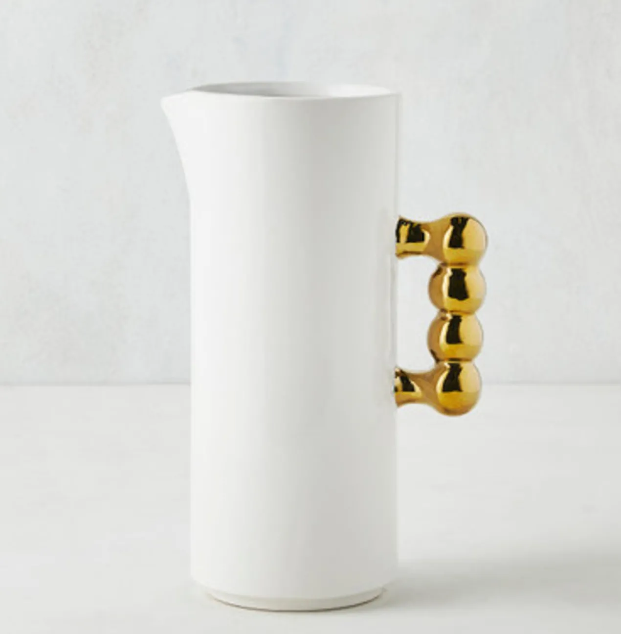 An eye-catching addition to any shelf or table. This pitcher is crafted of ceramic with a bright white finish and bauble handle in gold.