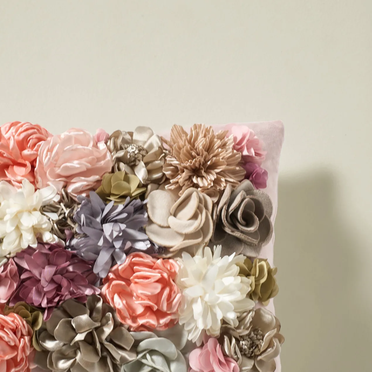 Adorned with dozens of intricately detailed blooms, this pillow brings incredible texture and whimsy to any sofa or chair. A feather insert ensures long-lasting comfort.