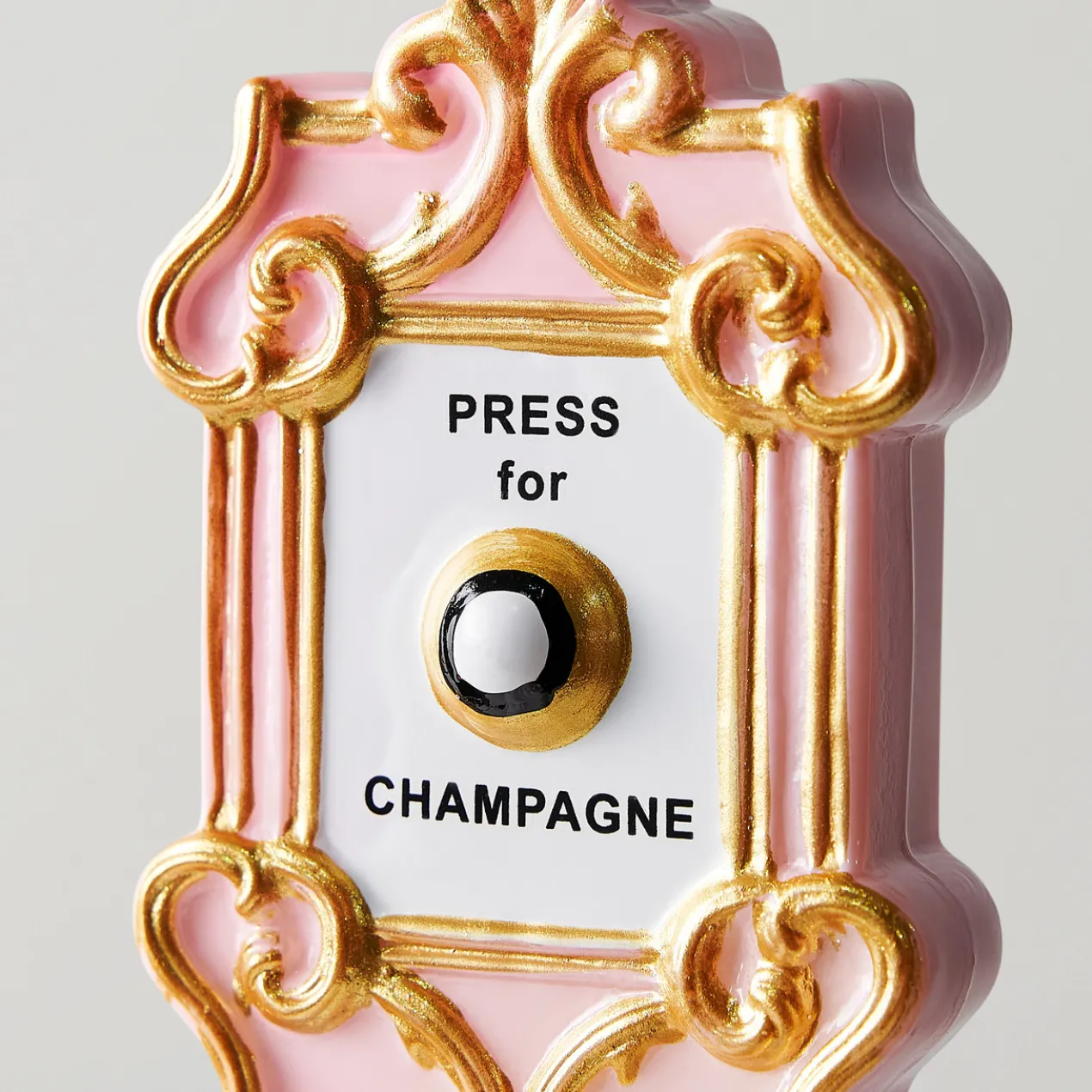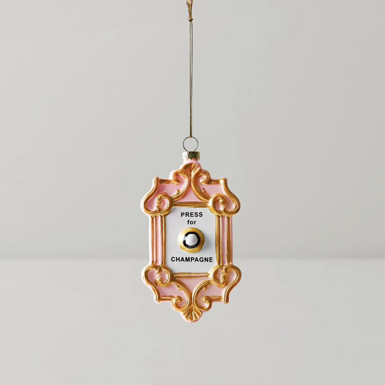 A fun “press for champagne” glass, hand-painted ornament. The perfect stocking stuffer for the champagne lovers in your life.