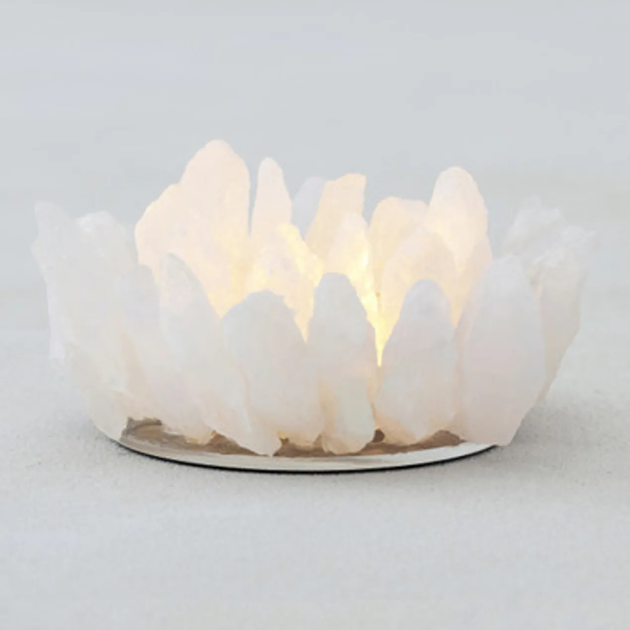 Our White Quartz Crystal tealight holder is made of authentic quartz crystals to create the ultimate in dramatic candlelight. A complex arrangement of the crystals is surrounds a glass cup which holds the candle, emanating light through the semi-transparent quartz for an ethereal ambience.