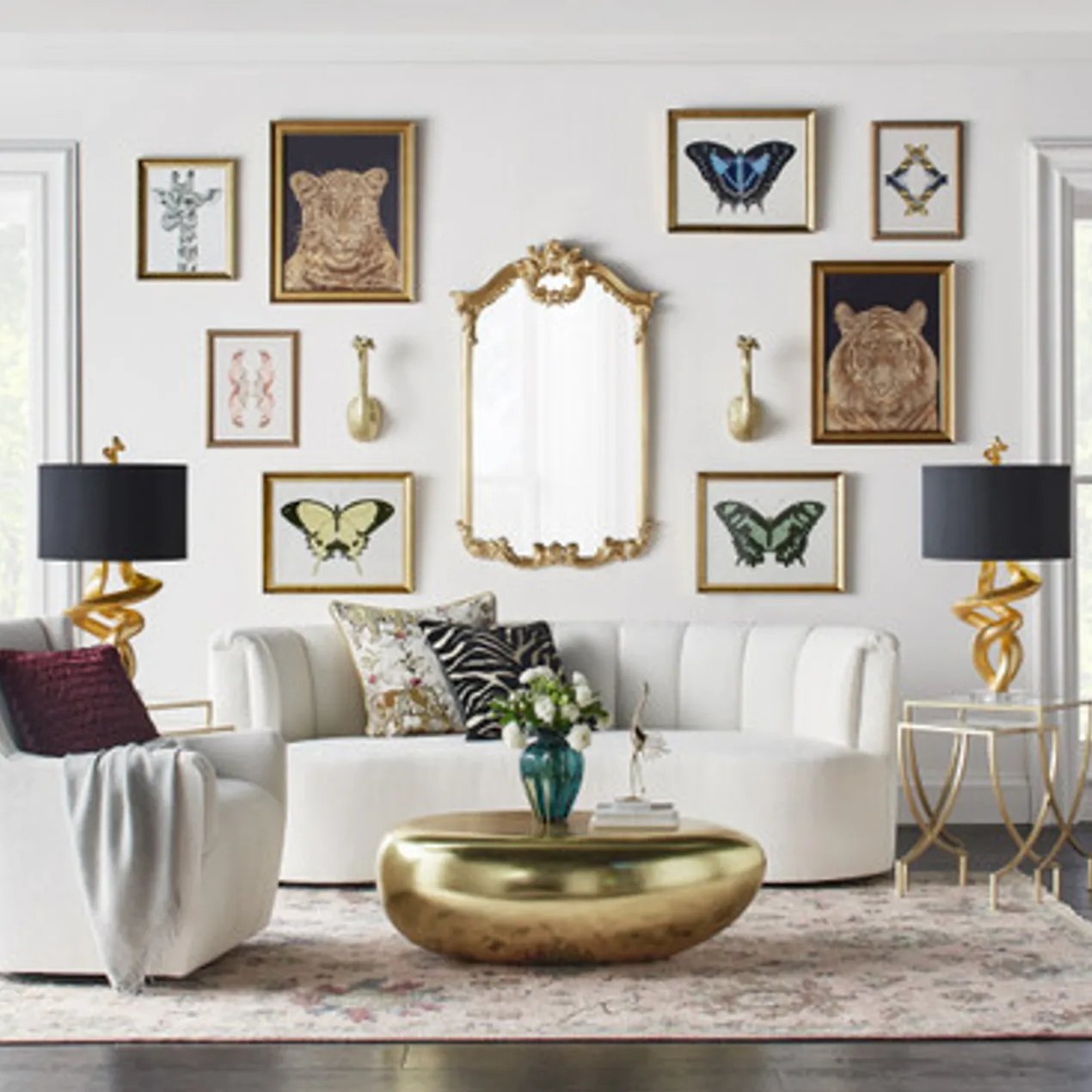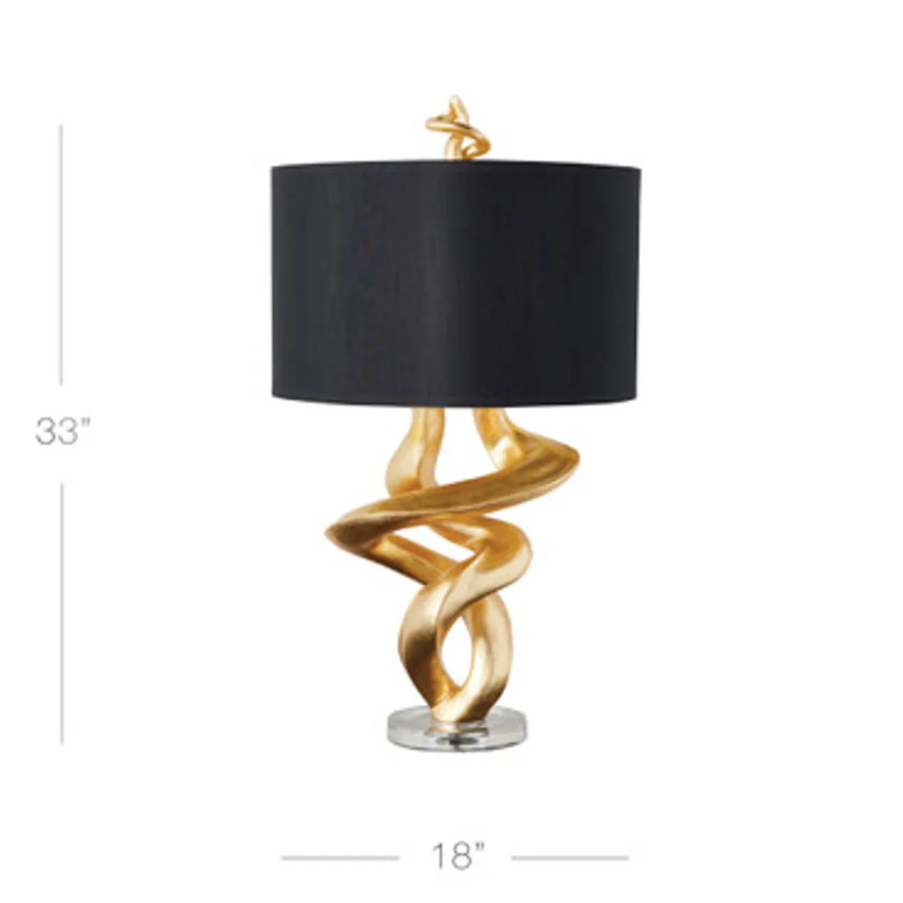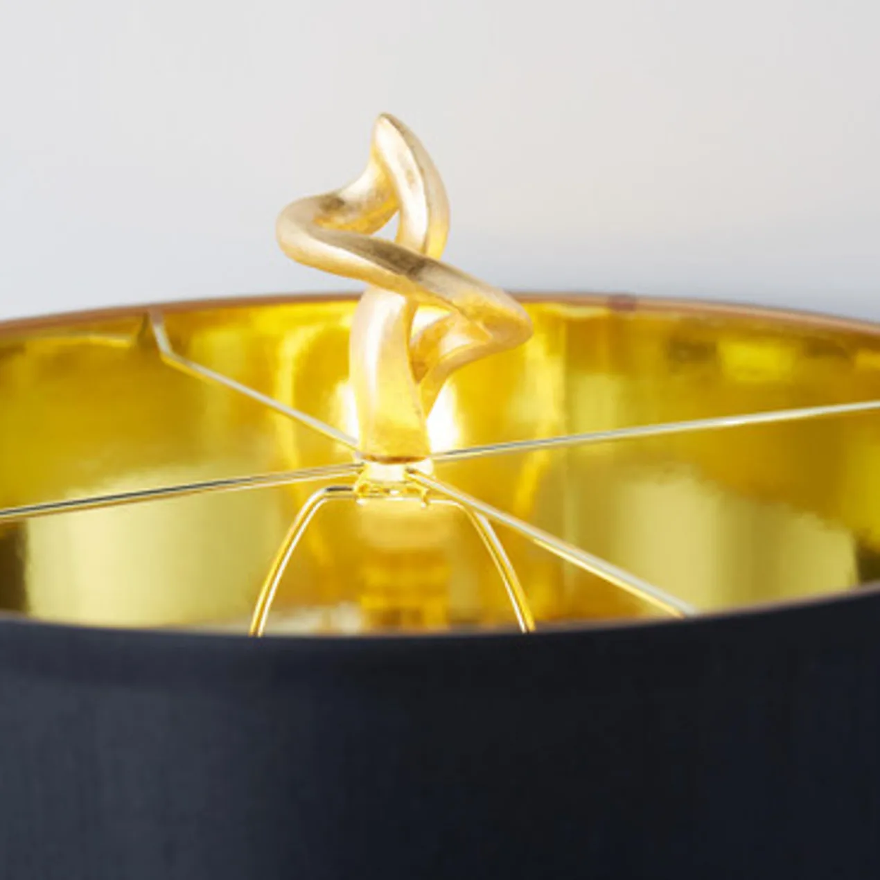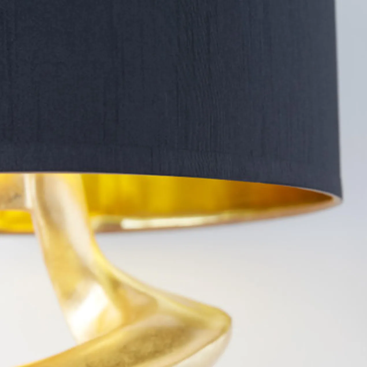 This table lamp makes an immediate impression with its bold, sculptural base finished in gold. A black linen drum shade with a gold-lined interior completes the look.