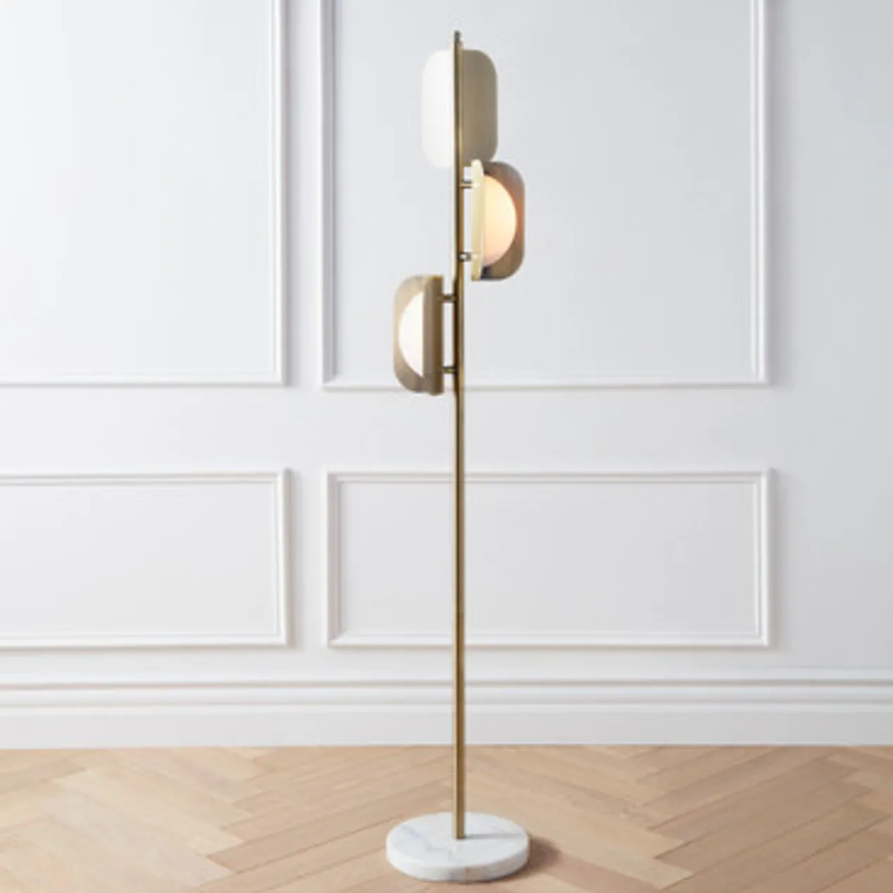Defined by its sleek, soft-gold-finished frame and frosted acrylic shades, this floor lamp makes a chic statement in any space. A round marble base makes for a refined finishing touch.
