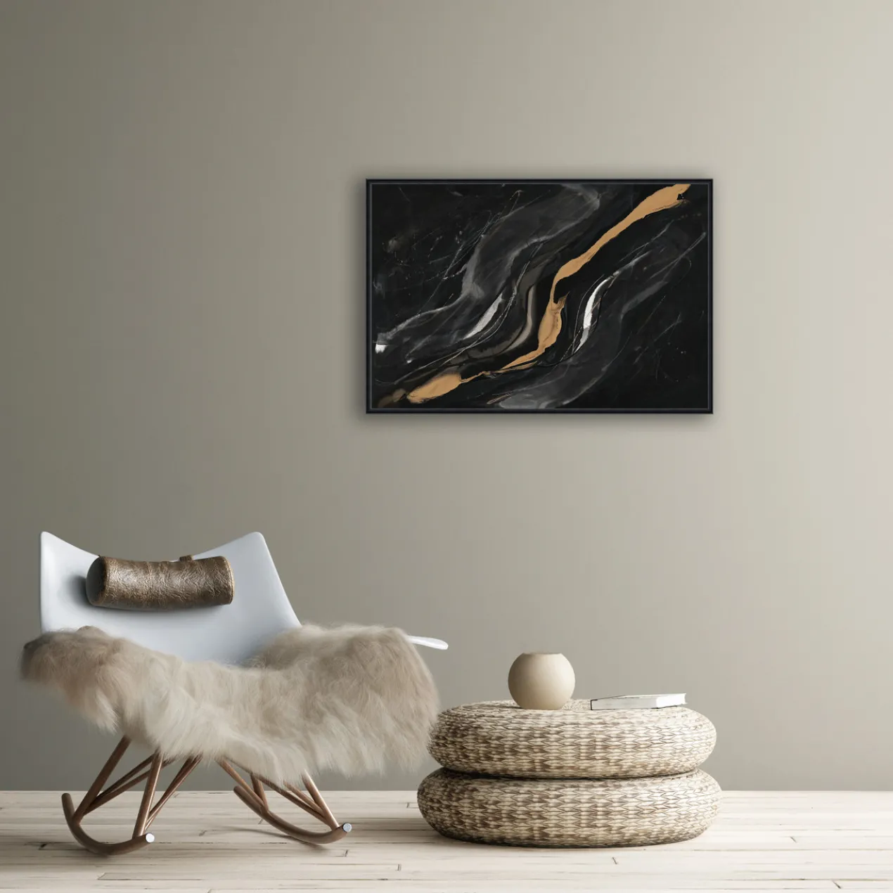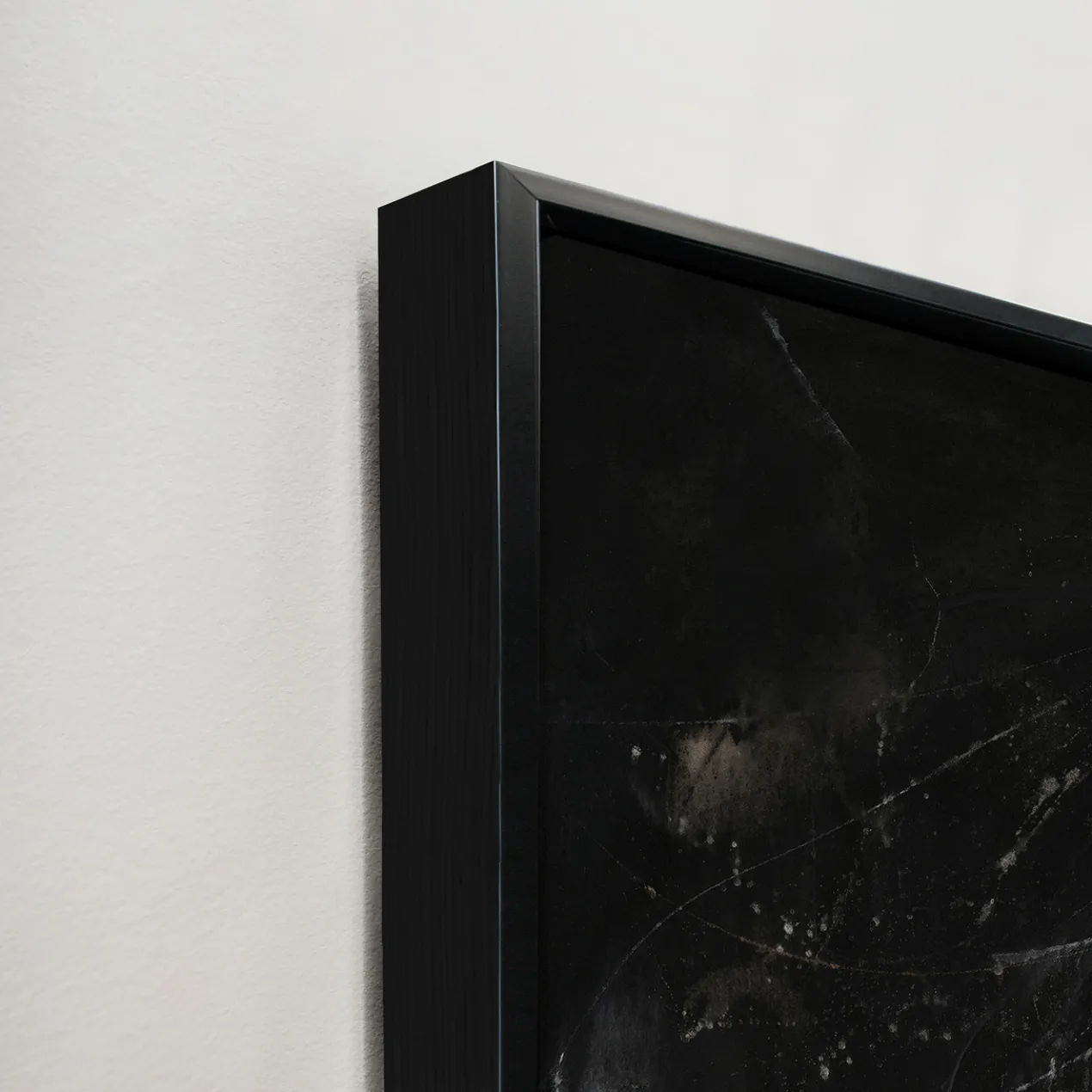 - Set in a black floater frame.