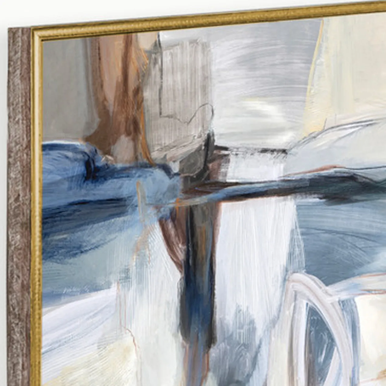 Stormy is a gallery wrapped canvas with hand-applied pallet knife embellishment and set in a warm wood tone with hammered gold (2 tone) floater frame.