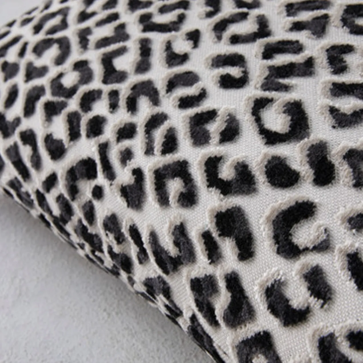 Woven on a jacquard loom in Belgium, this cut-velvet pillow features a high-low leopard print that combines three yarn colors for a striking tonal effect. Insert included.