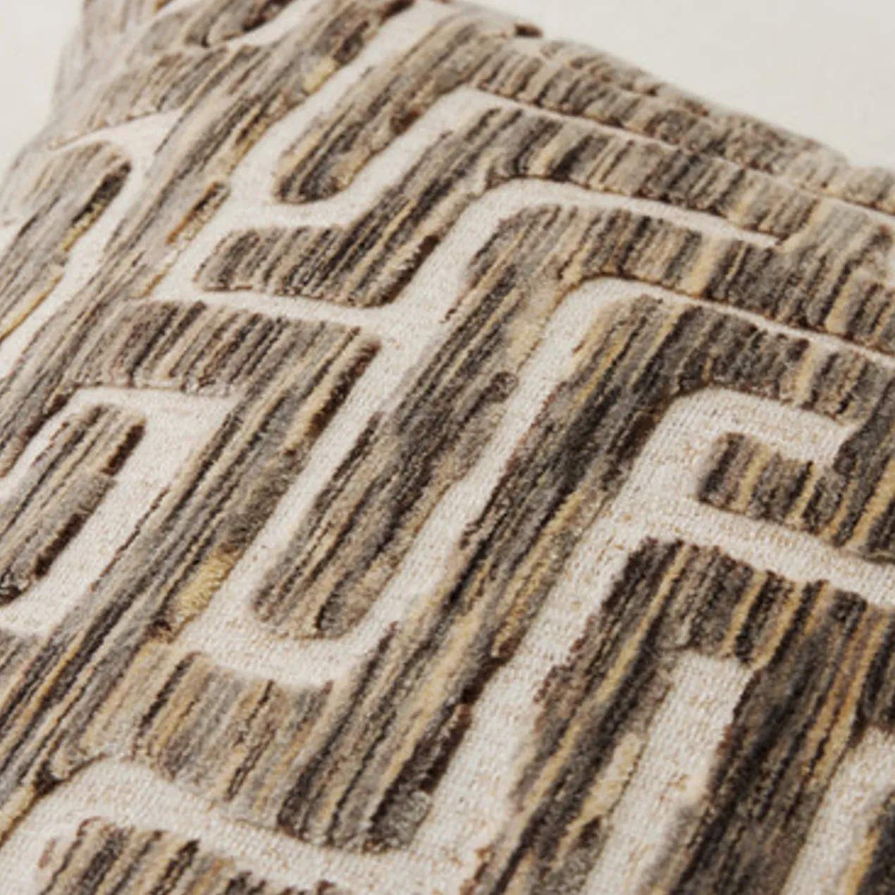 Introducing the Vega Pillow, a striking piece that combines high sheen cut velvet with a captivating maze design. In shades of grey and taupe, this pillow adds a touch of modern elegance to any setting. The solid back and clean knife-edge finish enhance its sleek look. Complete with a comfortable down insert. Elevate your decor with the Vega Pillow and redefine your space with its luxurious texture and contemporary design.