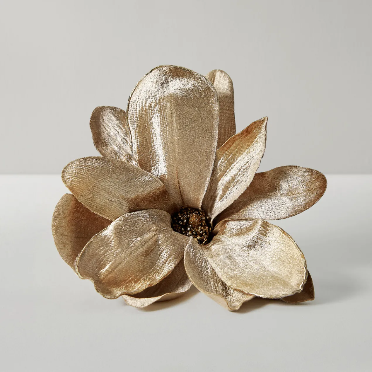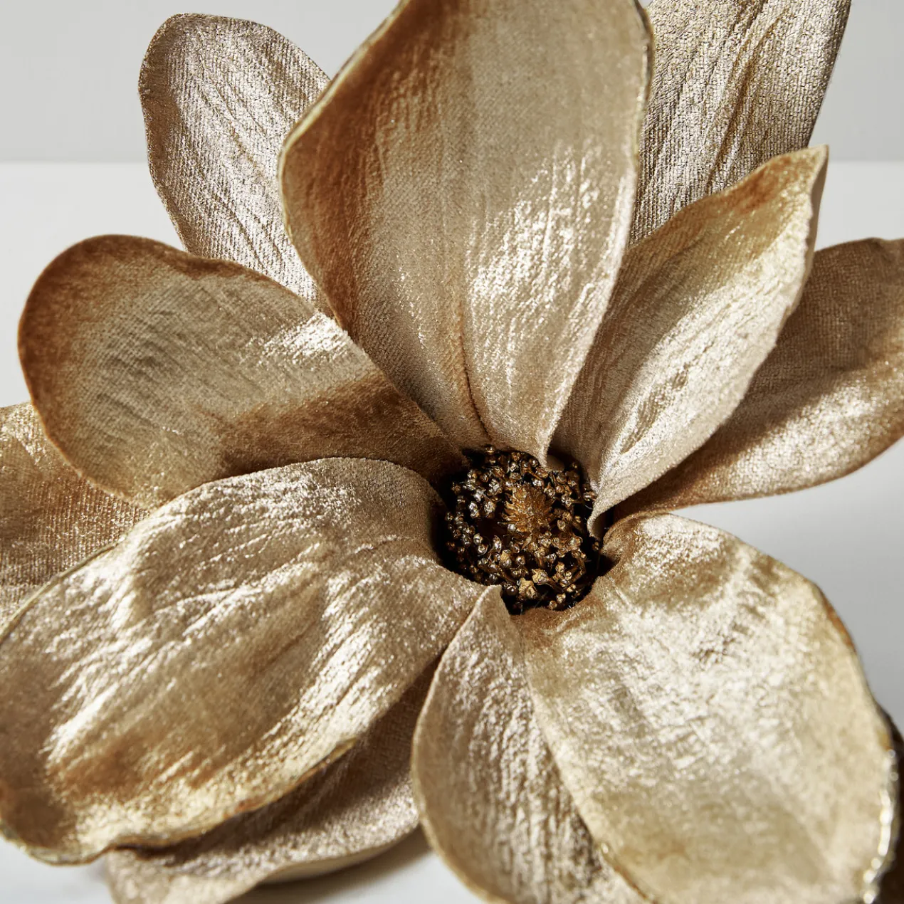 This set of elegant champagne hued velvet magnolia makes a charming and unexpected accent for any holiday decor.