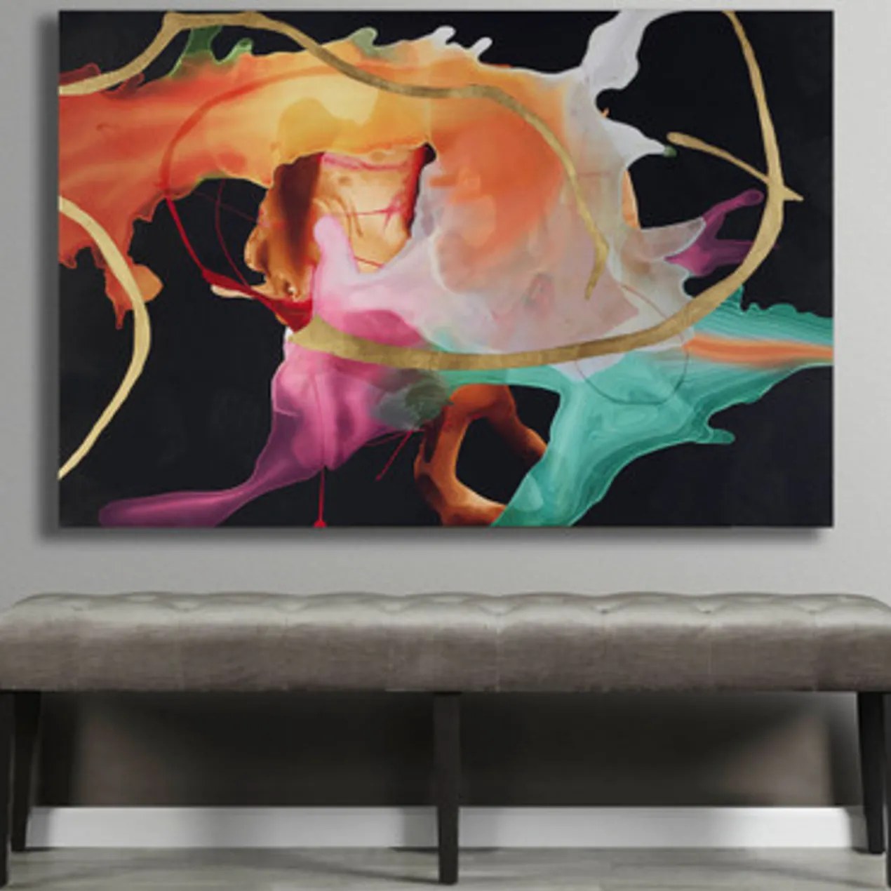 Printed on canvas with hand-applied gold embellishments, this modern abstraction enlivens any wall with its fluid brushstrokes and bold use of color. Unframed.