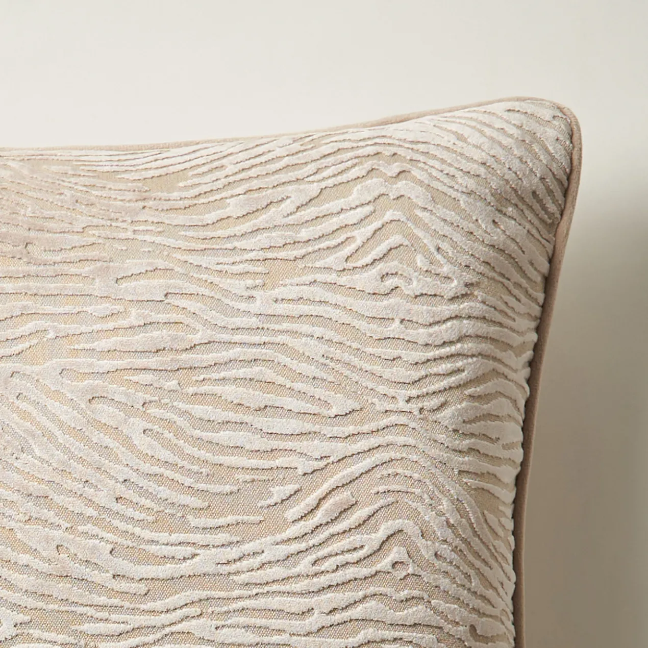 Our stylish Wavy Zebra accent pillow compliments any sofa or bed, featuring a cut-velvet subtle zebra design for dimensional color and softness. Pairs well with prints and textures for exotic flair.Removable cover with hidden zipper closure. Plush feather down Insert included.