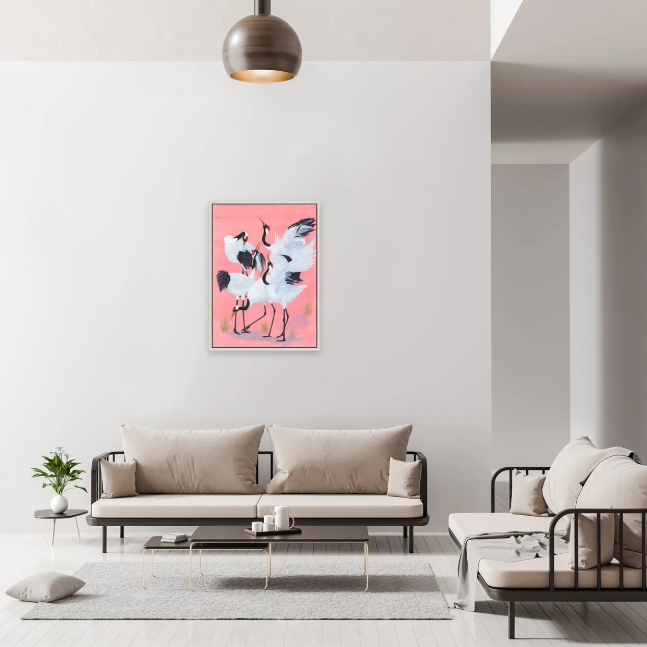 - Set in a white floater frame.
