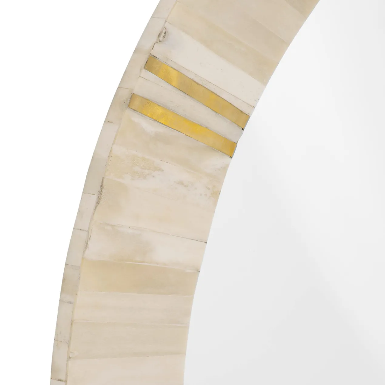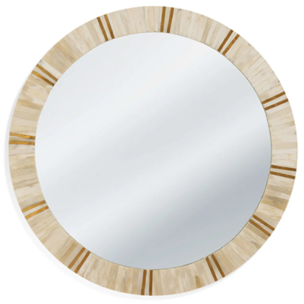 Our Brooklyn Mirror is round featuring natural cream colored bone with brass accents. The hand crafted details produced by a skilled artist lends itself to a unique technique and will vary slightly.