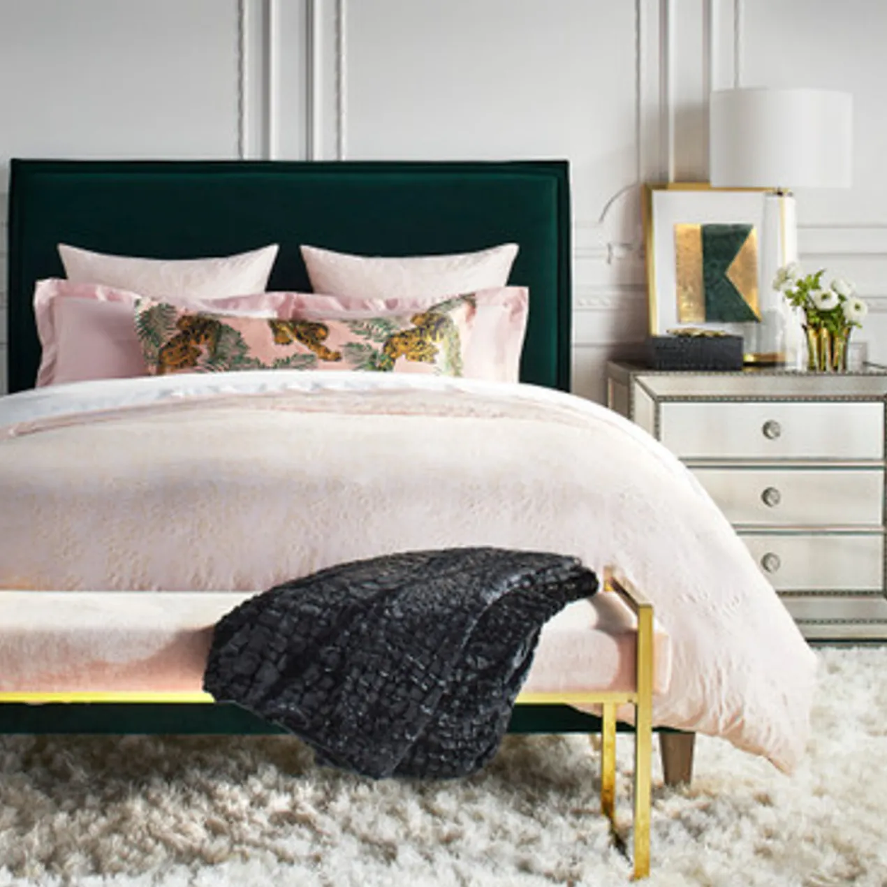 Our comfortably chic Clara bench is the perfect addition to any space. A plush upholstered seat cushion sits atop two open metal legs featuring a metallic gold finish for added style. Shown in Kenley Chenille Quartz.