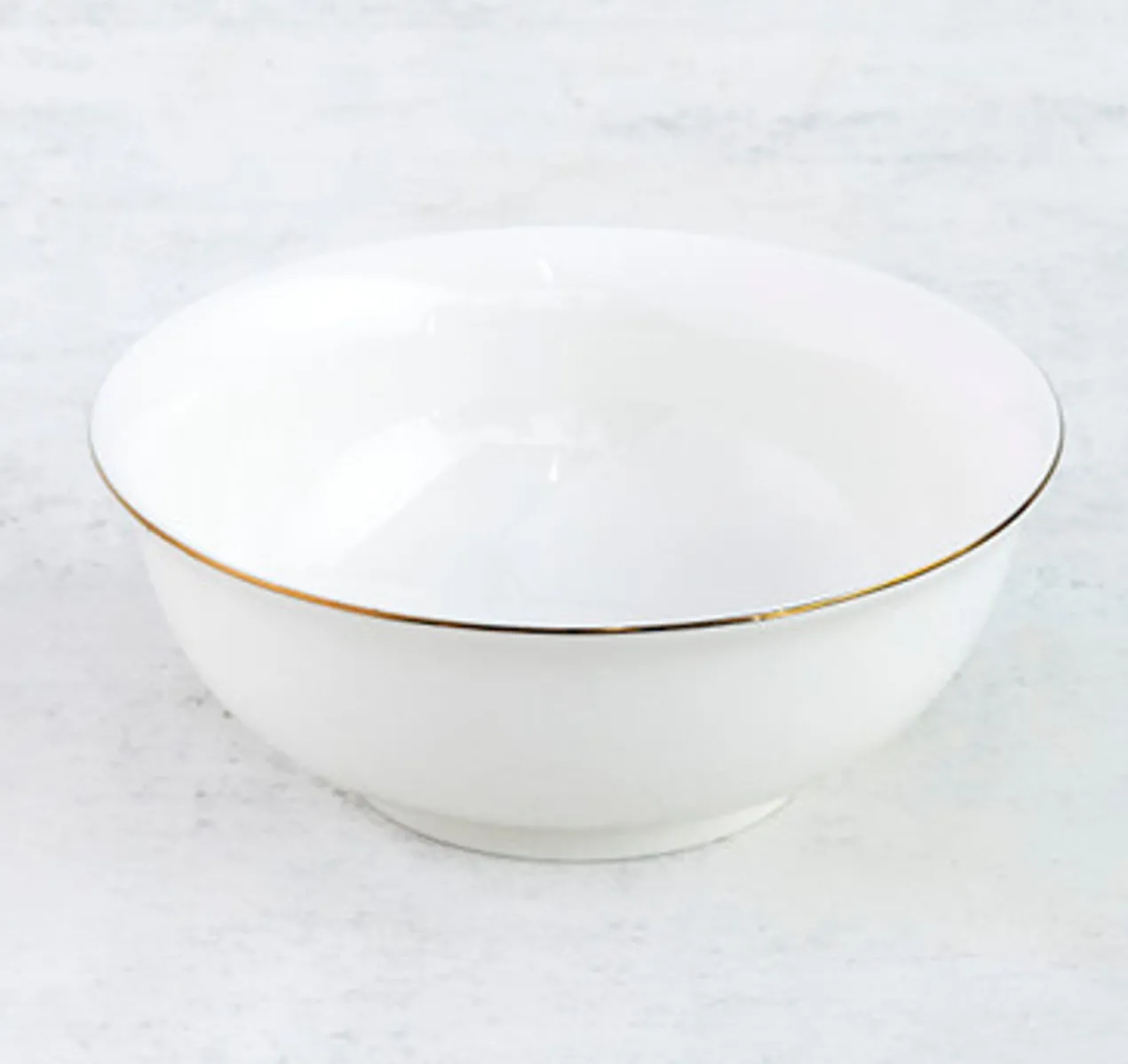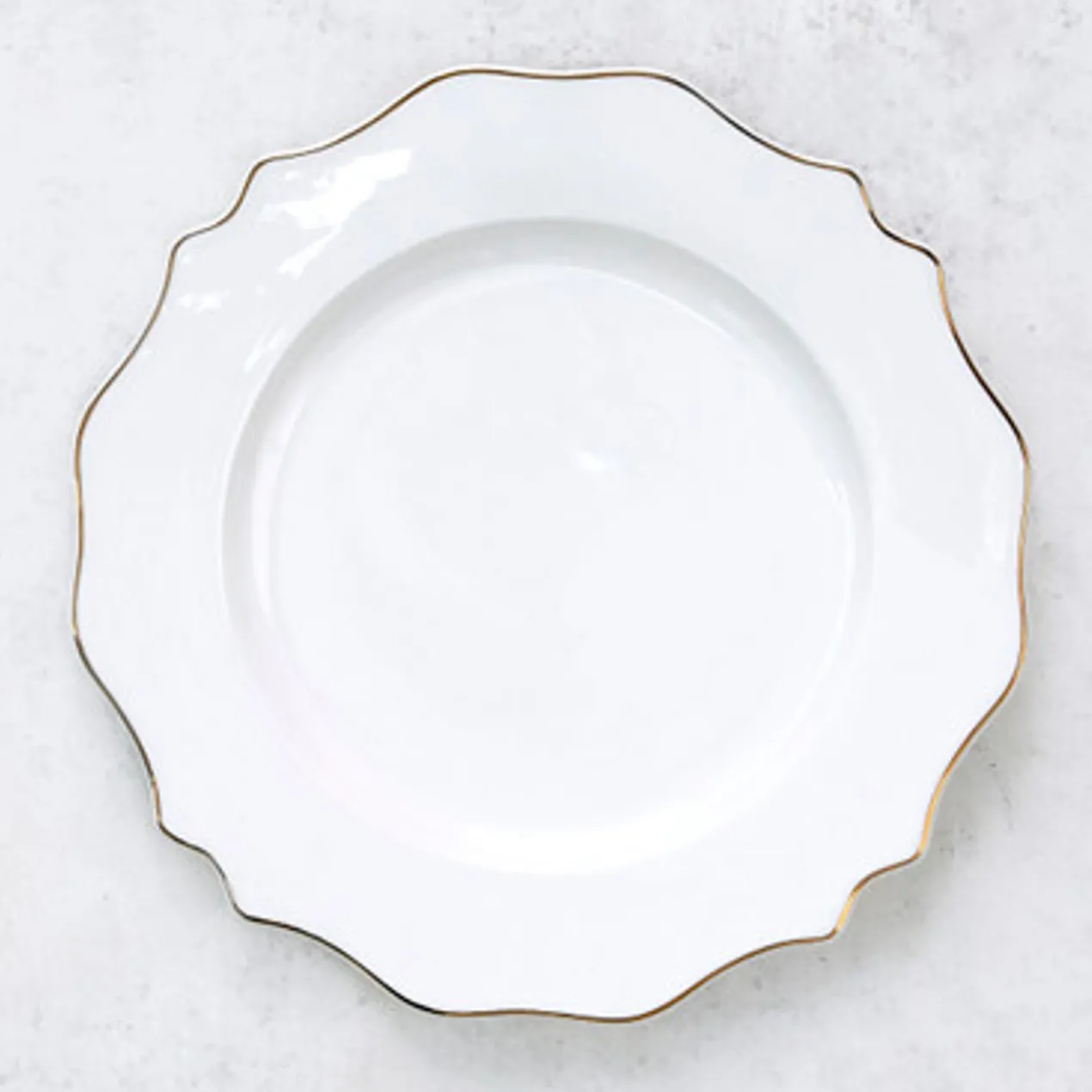 A stylish addition to any table, the pieces in our Coralie Collection are each crafted of porcelain with a scalloped, petal-like rim and gold border.