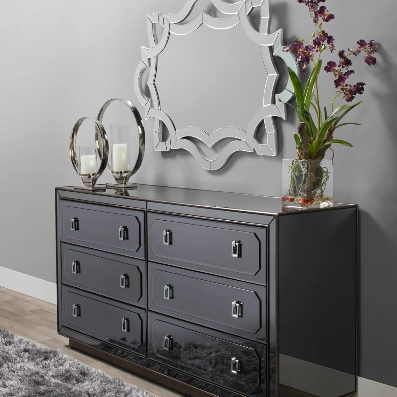 Our lovely faux aubergine oncidium in glass brings you the lavish look of fresh florals all year long. This attractive flowering plan has been faithfully replicated with two long stalks of ruffled aubergine blossoms and is artfully arranged with a gnarled branch in a clear glass vase.