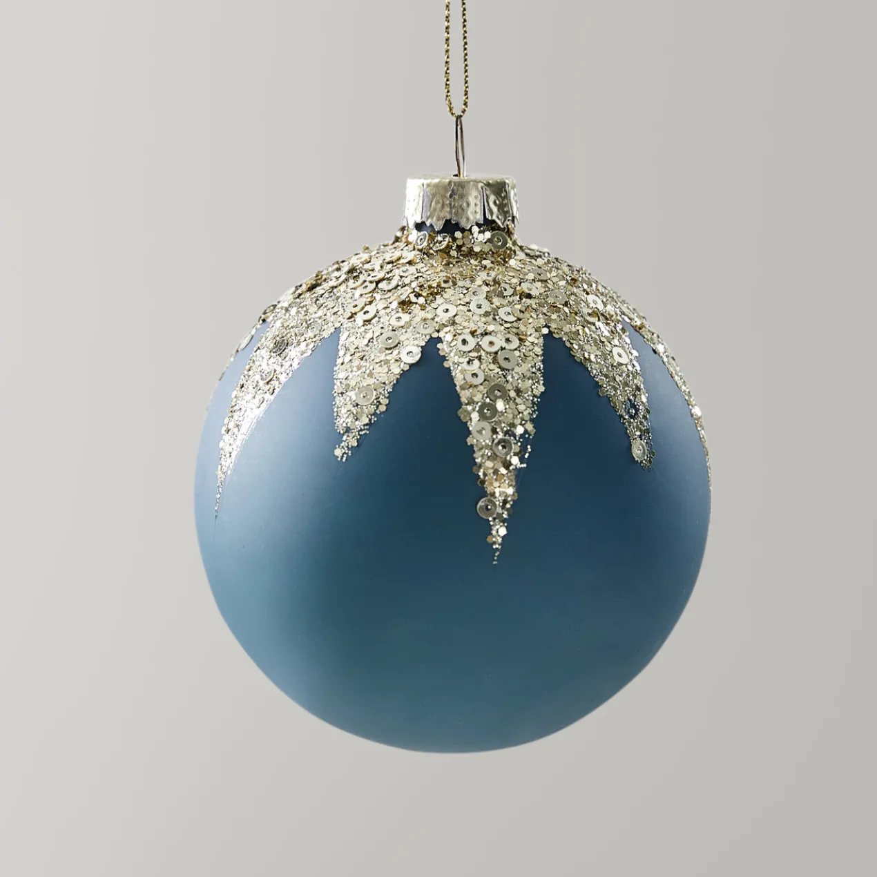 Add a celestial vibe to your holiday decorating with this glittered and sequined starburst ornament in a stunning shade of sapphire.
