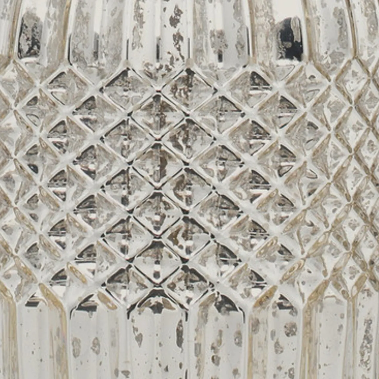 This antique mercury glass table lamp is an elegantly patterned contemporary lamp with a traditional aesthetic resting on a clear acrylic base.