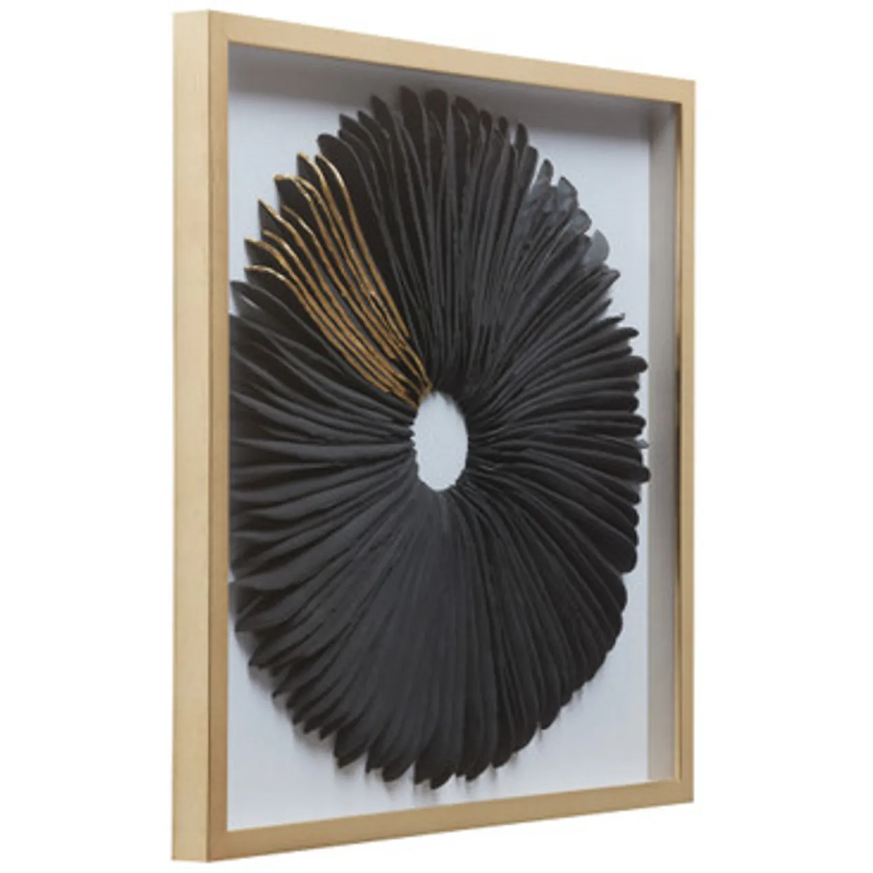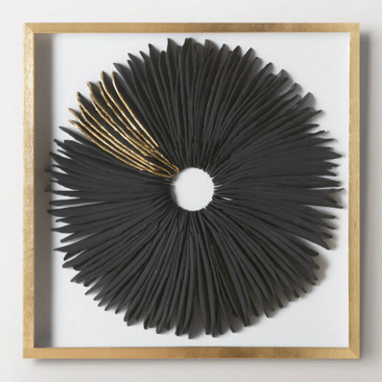 Featuring hand-sculpted clay arranged in a circular pattern with gilded accents, this dimensional work adds an incredible element of texture and shine to the wall. Displayed under glass in a gold shadowbox frame.